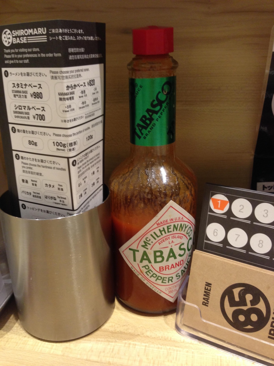 数分後ラーメン到着。麺は細麺。スープは一風堂の普通の店舗よりちょっと濃厚。でも豚の臭みは無い。これが一風堂開業時(1985年)のスープに近いそうな。細麺との相性も良い(替え玉あり)。美味しいのだが、一風堂ではおなじみのきくらげが入っていない(有料のトッピング可能)。ここは残念。一風堂よりも価格が安いので仕方がないかも。なお、紅生姜は無料トッピング可能。また外国人向けなのかテーブルにはなぜかタバスコあり。- 旅行時期