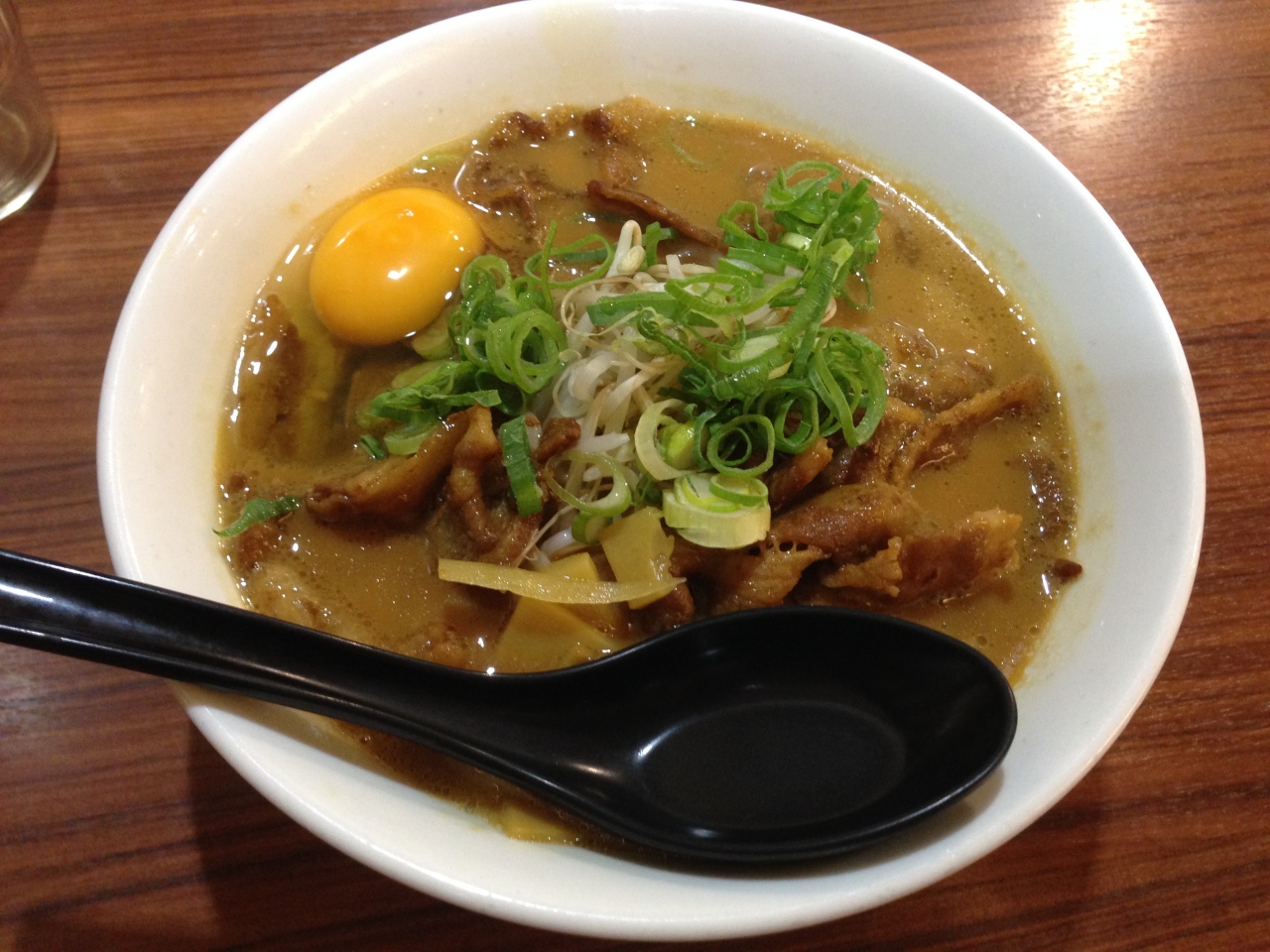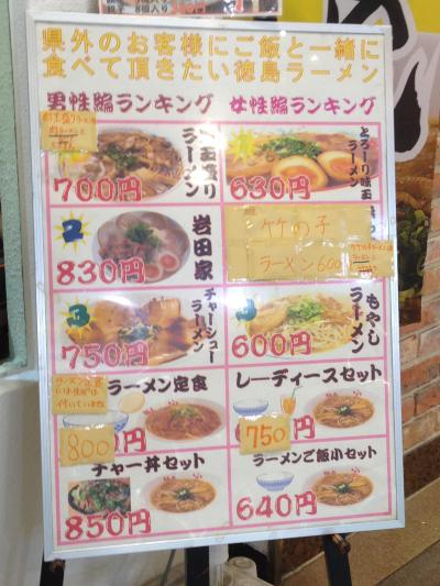 濃い茶色のスープ、甘辛く煮た豚バラ肉、生卵が入った徳島ラーメンが食べたいのだがメニューがわかりづらい。テーブルにメニューがなかったので店員に伝えると肉ラーメンに生卵トッピングだそうなのでそれを注文。