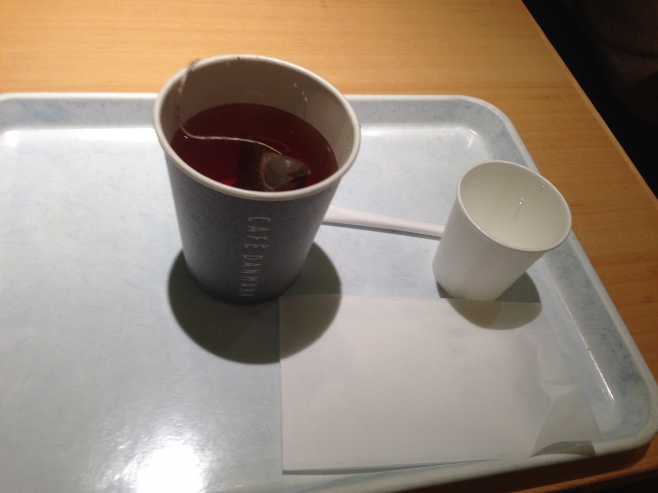 焼きたてのパンの香りにも惹かれたものの、朝食を食べたばかりであったため、紅茶を注文。紅茶が入った紙カップとは別に小さめの紙カップが別に付く。ティーバックはこちらに入れてくださいという配慮らしい。