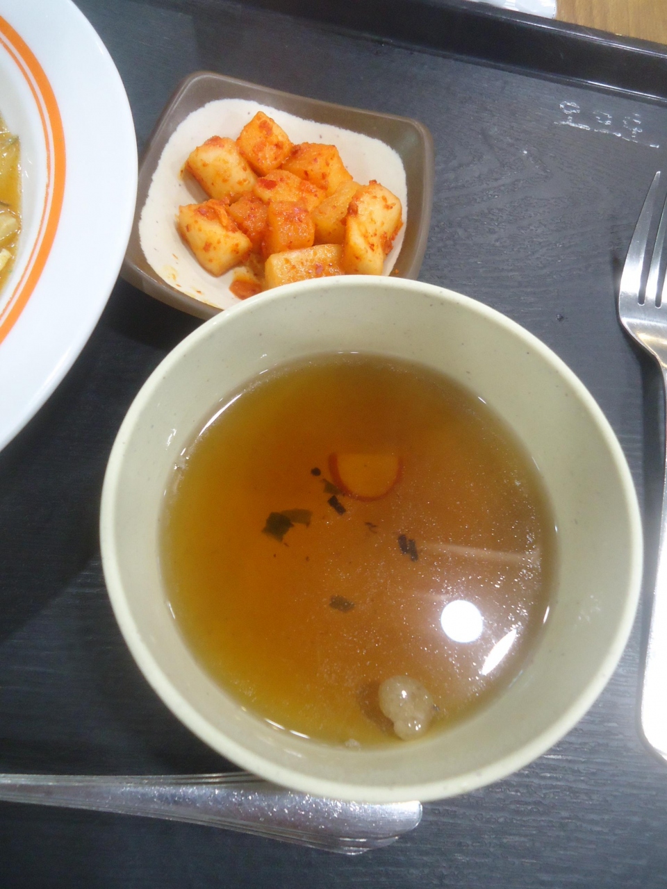 フードコート名物のポケベルを渡され、5分少々とオムライス到着。見た目は日本で食べるオムライスと変わらず。ただし付け合わせが大根カクテキと韓国風のお吸い物。
