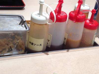 食券を渡すと数分で到着。テーブルの前にはソース、ドレッシング、大根の漬物が置いてある、ドレッシングは青じそ、人参の2種類。