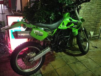 トルコライスの名店「ツル茶ん」のあるビルの地下にあるカフェ。地下に行く入り口には緑のオートバイが置いてあります。
