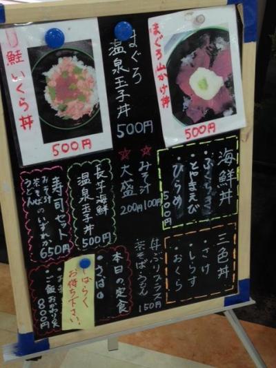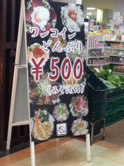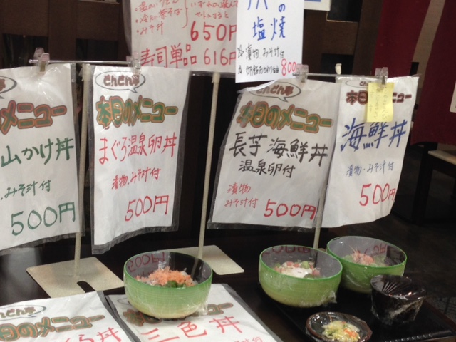 メニューは寿司、日替わり定食、ワンコインどんぶり。ワンコインどんぶりは味噌汁、漬け物付きで500円(税込)。今日はまぐろ山かけ丼、鮭いくら丼、まぐろ温泉玉子丼、三食丼、海鮮丼がラインナップ。その中で海鮮丼を注文。