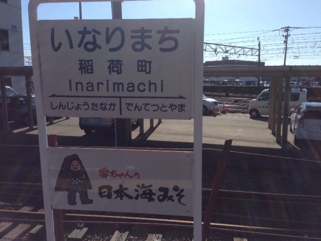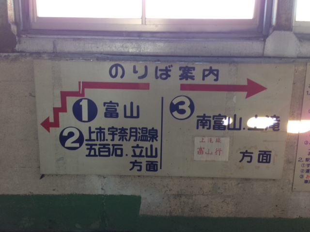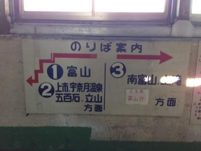 ホームは不二越・上滝線のホームである1番線と本線のホームである2番線、3番線の3つ。ホーム間は地下道での移動が必要。2番線、3番線ホームはカーブしており、1番線と2番線の間には車両基地があり、オリジナル車両を始め、西武、京阪、東急等から譲渡された車両が休んでいます。また2番線の裏手には稲荷公園が広がっています。
