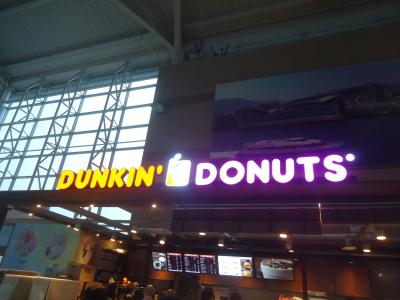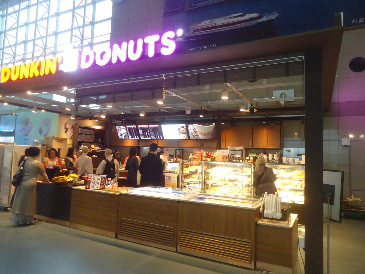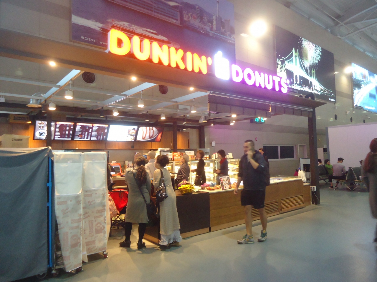 金海国際空港国際線出発ロビー(2階)ににあるダンキンドーナツ。出国審査後にある数少ない飲食店のひとつ。イートインスペースはなく出発ロビーのベンチで食べるかテイクアウトして航空機に持ち込む人が多い模様(実際搭乗した飛行機の中で食べている人も多かった)。