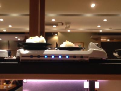 店内は板前がその場で握っており、タッチパネルで注文すると複線のレーンから北陸新幹線を模した(JR西日本許諾済みとか)コンベア?で運ばれてきます(北陸の回転寿し屋さんなので通常レーンには回っていません!)。
