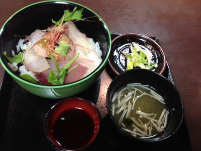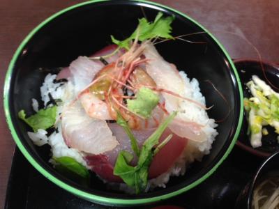 運ばれてきた海鮮丼、とやまえび、ひらまさ、さす(カジキマグロを昆布しめしたもの)。少々ボリューム感に欠けますが、魚屋さん直営だけあって味は間違いなし。価格を考えたら合格点。- 旅行時期