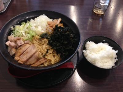 麺は細麺、太麺から選べ、長ネギ、ブロック状に切ったチャーシュー&玉ねぎ、メンマ、岩海苔がトッピングされている。麺は50円増しで大盛り、100円増しで特盛りに変更可能(特盛りは結構なボリュームです)。個人的にはすりごまとお酢を加えるとさっぱりして美味しい。