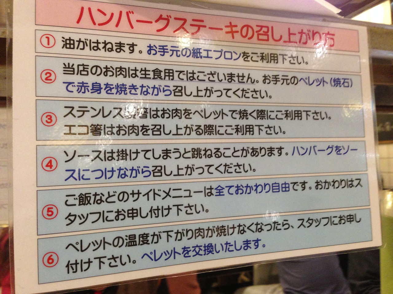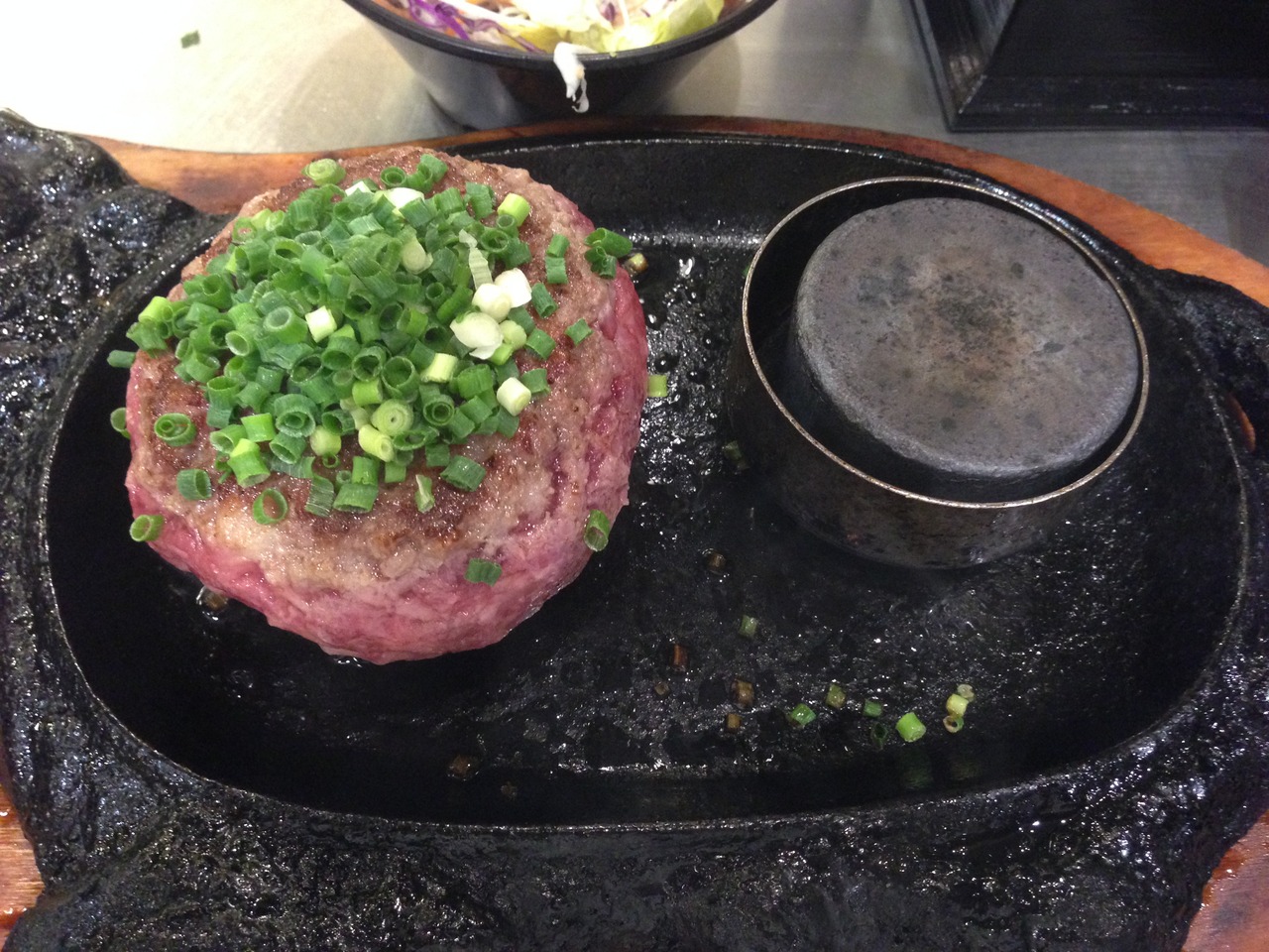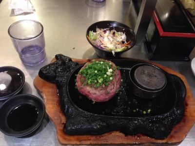 運ばれてきたハンバーグはソフトボールの球のような感じ。中身は完全レア(生?)。それをペレット(熱々な石)の上にのせ、好きな固さにして食べます。ペレットの温度が下がったら取り替えてもらうことも可能。