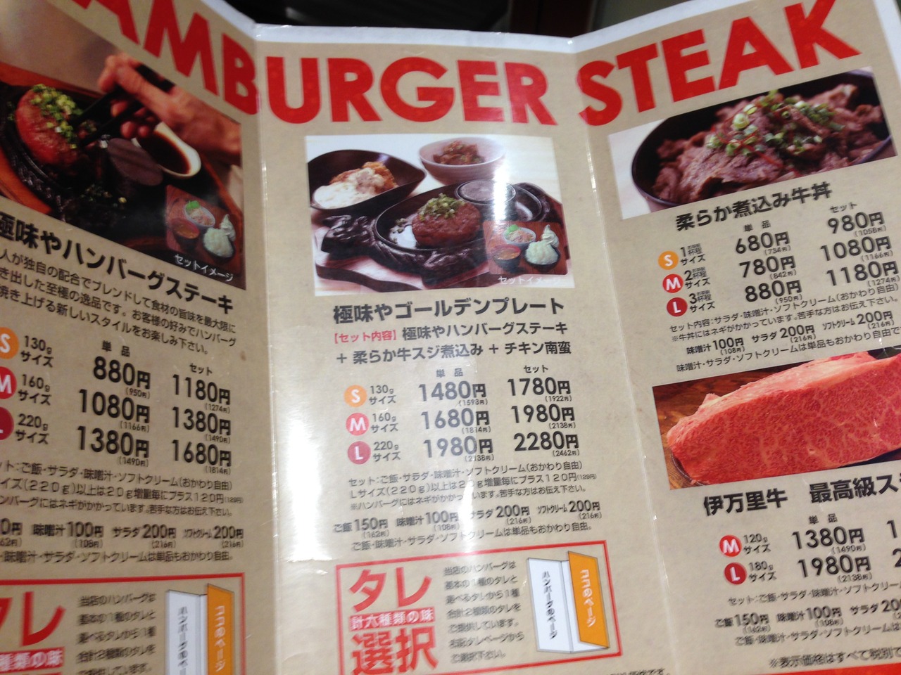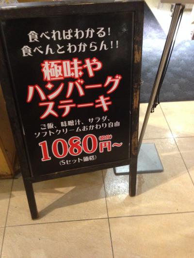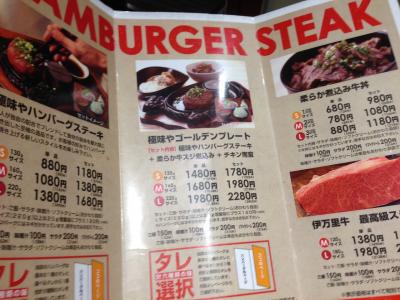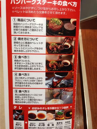 今回はLサイズ(220g)のセットを注文。ごはん、味噌汁、サラダ、デザートのソフトクリームは食べ放題。漬物もあり。またハンバーグのソースも数種類あり(鉄板がはねるのでハンバーグにかけずつけた方が良い)。