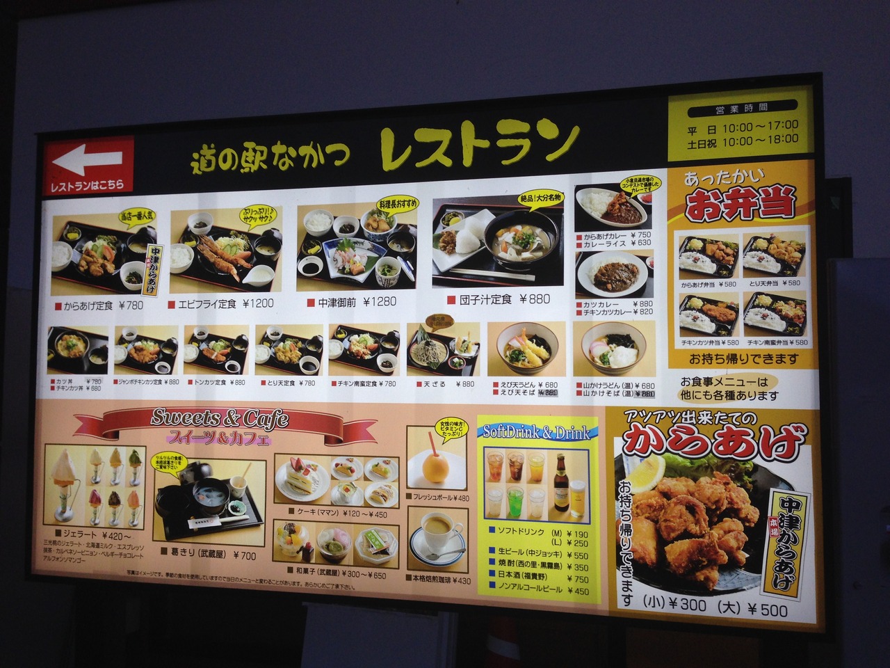 レストランには中津名物のから揚げあり。注文(食券)してから3分少々かかりますが、揚げたてを出してくれます。3個から4個入り(300円)をいただきましたが、充分なボリューム有り。車でなければビールがほしい濃い目の味でした。