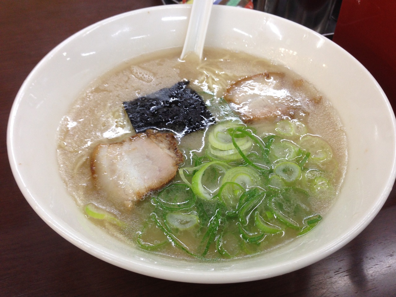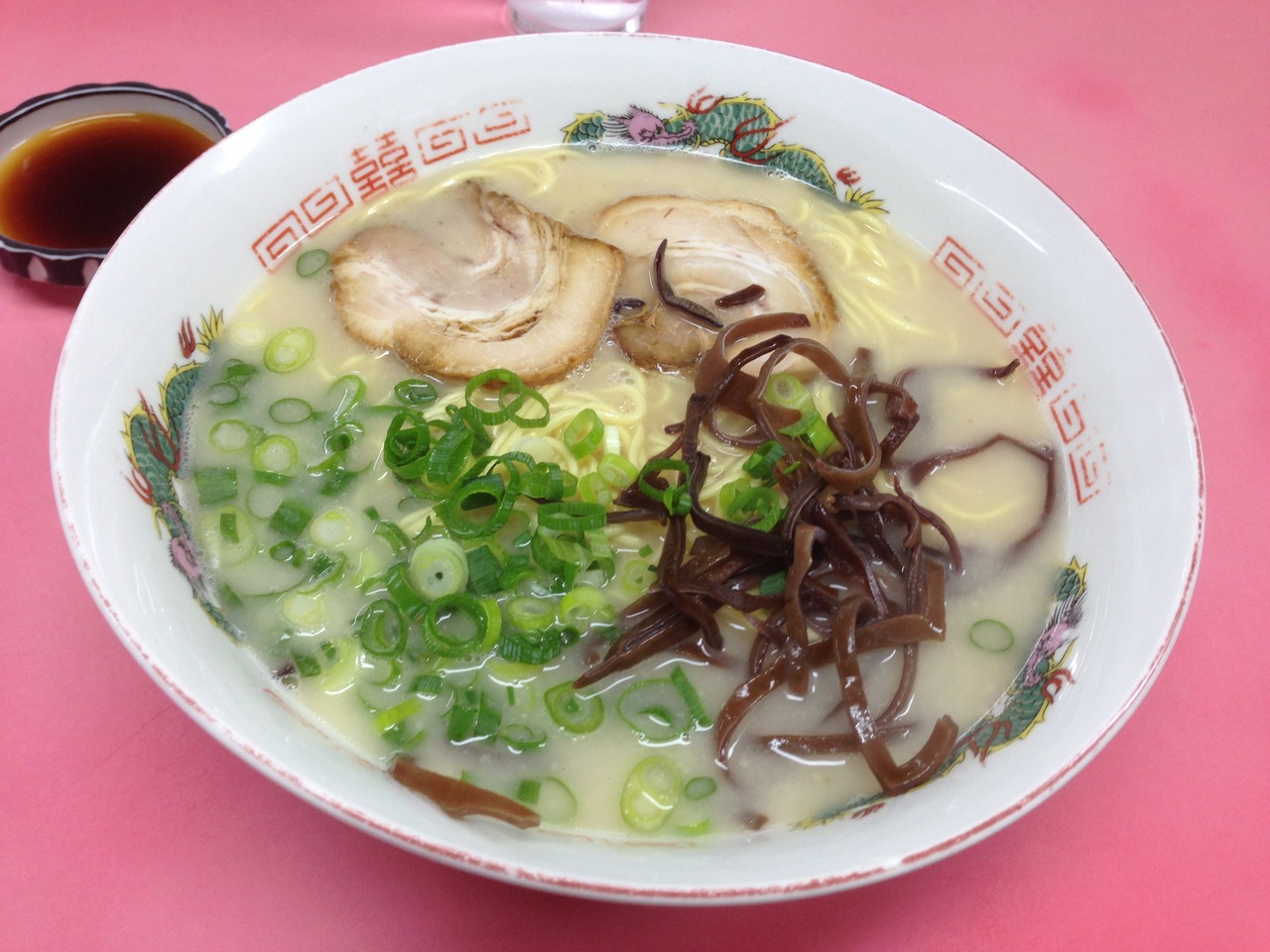 ラーメンはチャーシュウ2枚、のり1枚、ねぎがのったシンプルなもの。豚骨スープはとろり系。臭みが少なく柔らかい味。凝っていない懐かしい味。紅生姜、高菜漬けあり。大盛りも替え玉も可能。