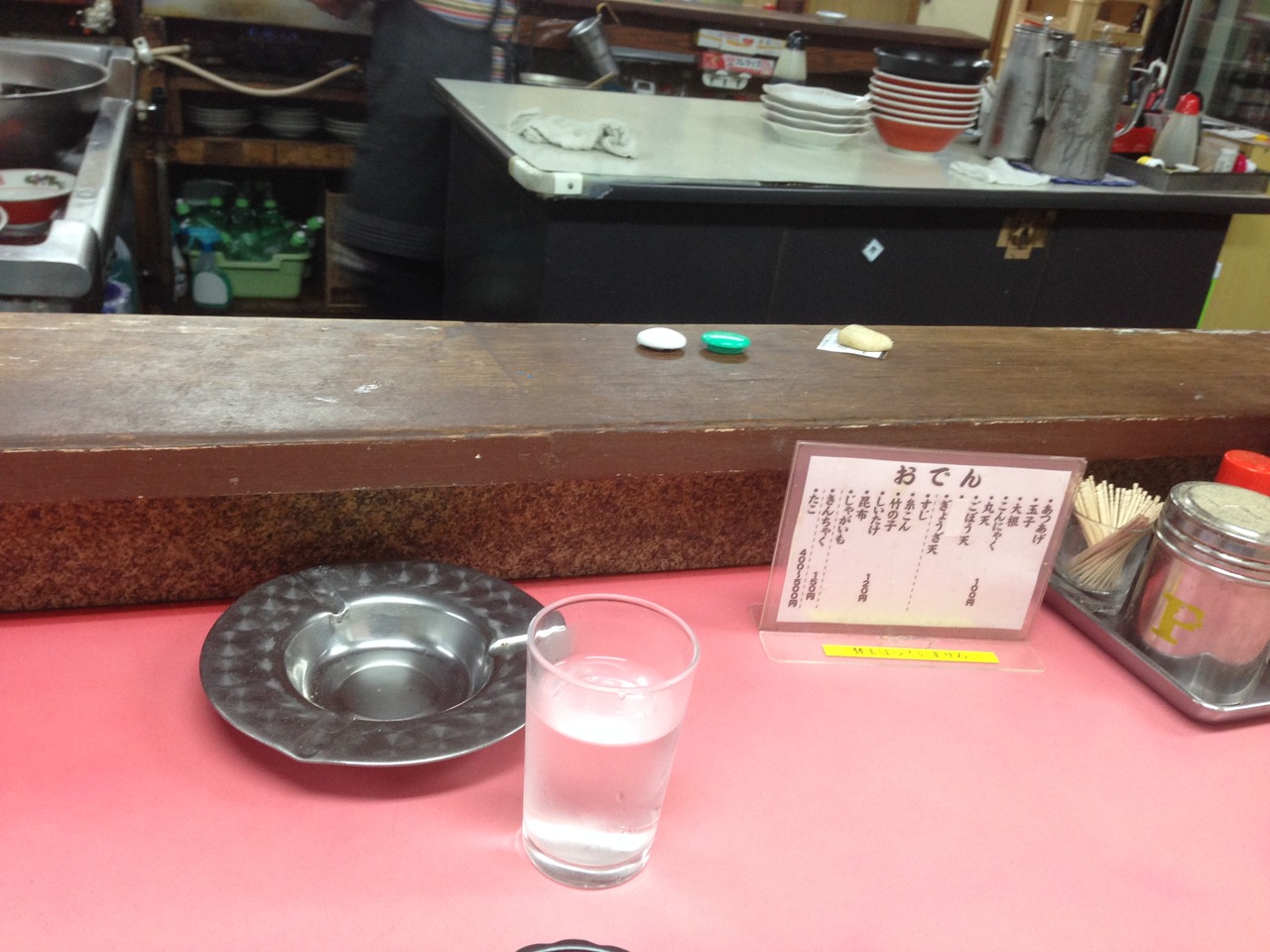 お店は昭和の古いラーメン屋さんのイメージ。店内もU字型のカウンター席のみ。横ではおでんを炊いていて、追加注文可能。