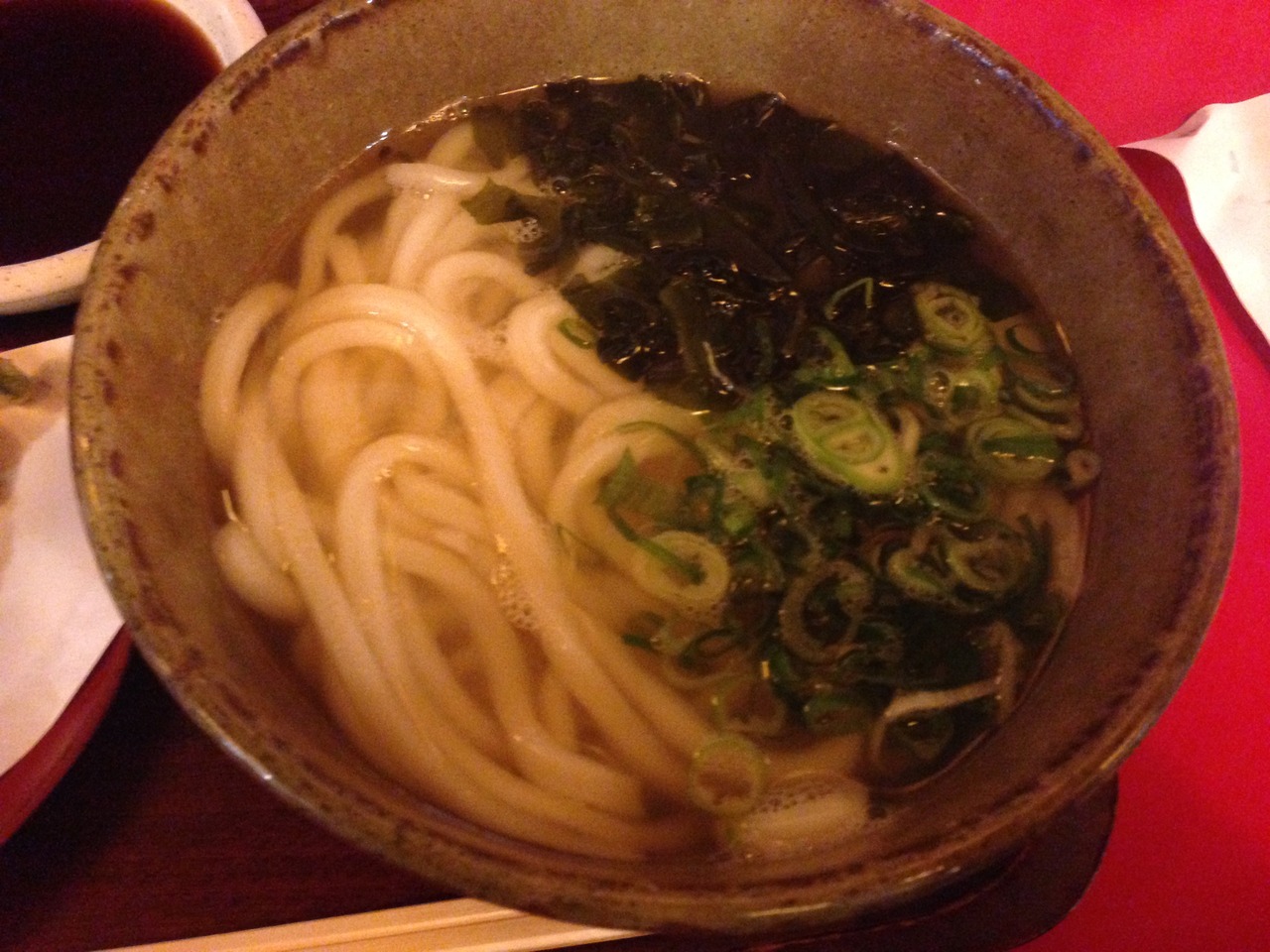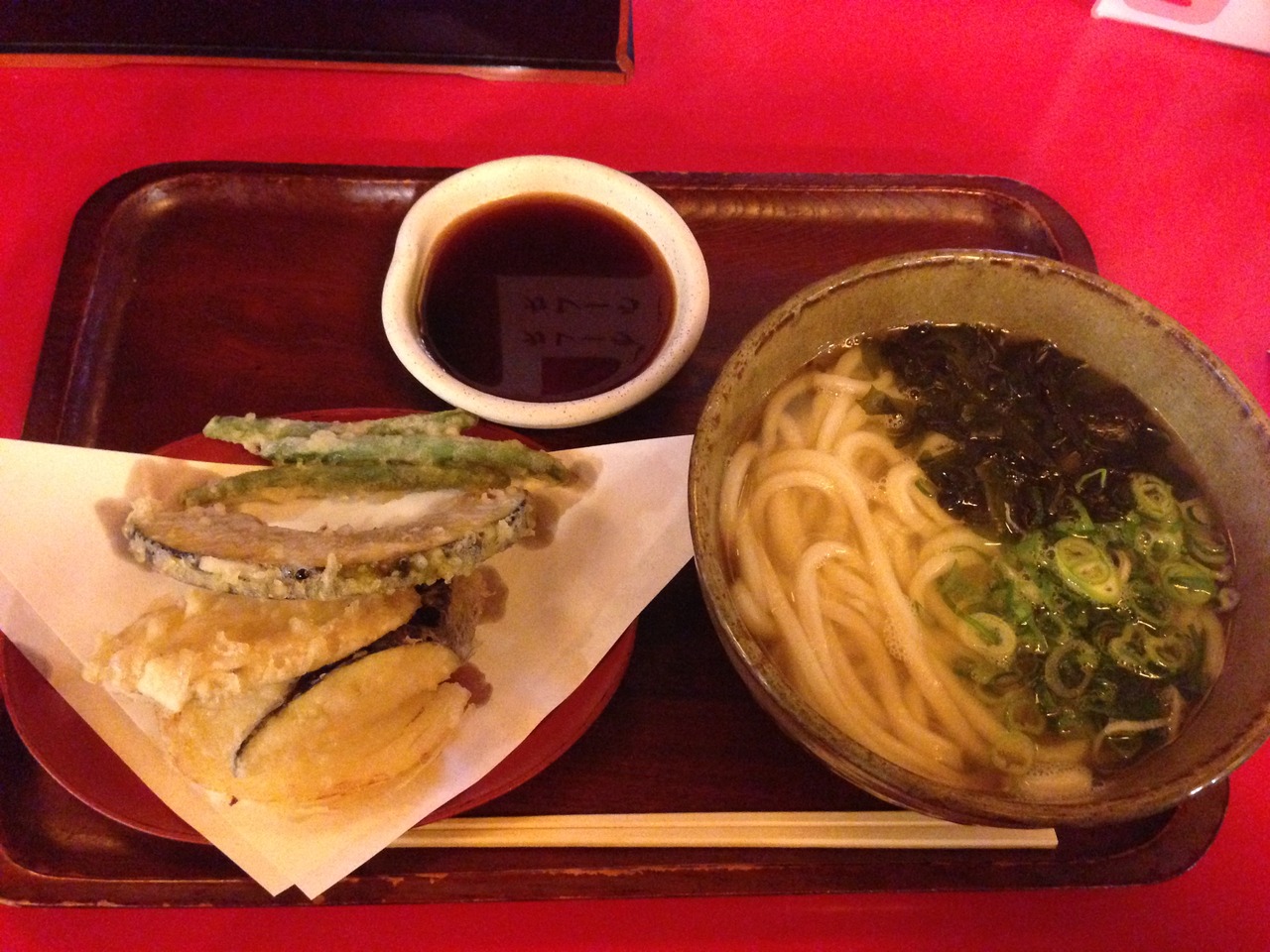 名店街の多くの店が月初めはワンコインメニューを提供しているそうで、伺った日は野菜天ぷらとわかめうどんのセットが500円!。注文して5分少々するとうどんと天ぷらが到着。野菜天ぷらはたまねぎ、いんげん、茄子、かぼちゃ。天つゆが別にあり、うどんに入れなくても良い感じ(少々濃い感じだが塩辛くなく丁度良い感じでした)。揚げたての天ぷらは脂っぽくなくさくさくでした。