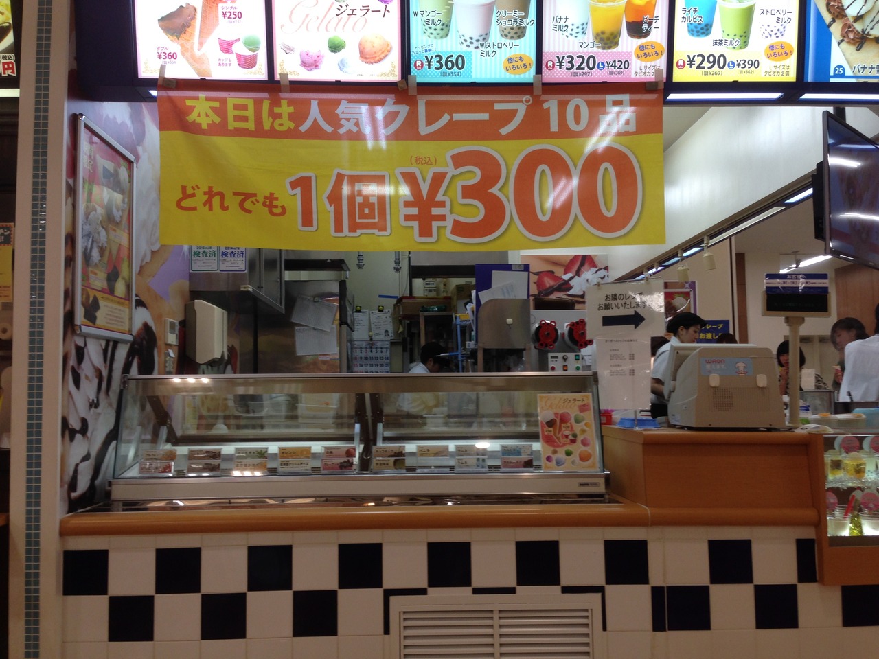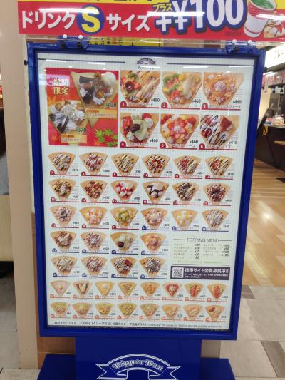 メニューが40種類以上あるようで、正直迷うことも。ただし、人気クレープ300円セール等をよく行っているのでお得なメニューを頼む率が高いかも(クレープの日(毎月29日等)はいつも行列ができています。なおJAF会員は会員証の提示でクレープの一部メニューが200円程度で食べられます。- 旅行時期