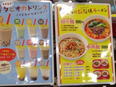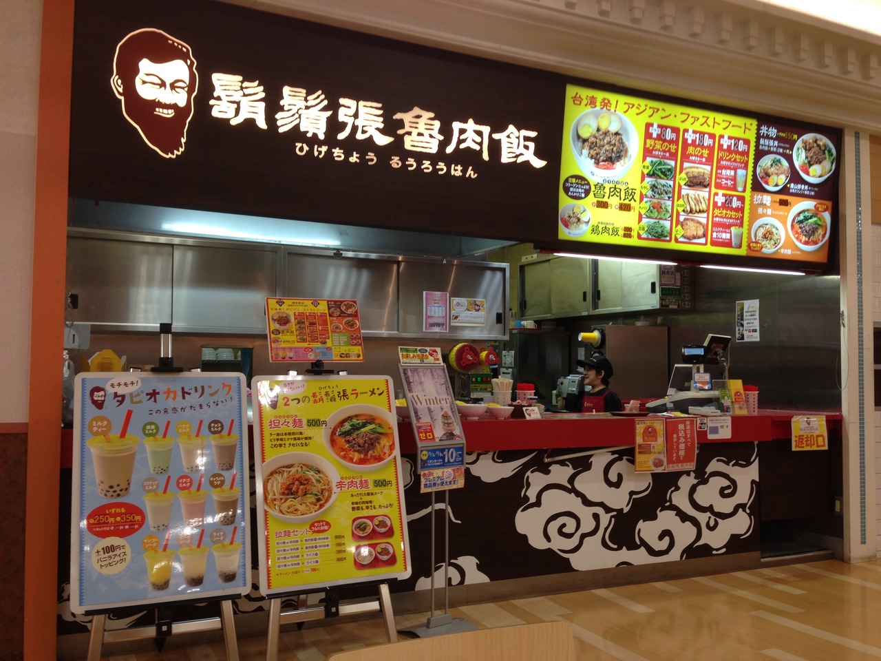 御経塚イオンのお店はフードコート内にあり、金沢工大前店に比べメニューは少なめ。魯肉飯、鶏肉飯、担々麺、辛肉麺があり、それぞれ野菜、肉(バラ肉/ほほ肉を煮たものまたはパーコー)のトッピングが可能。またタピオカドリンクがありました。