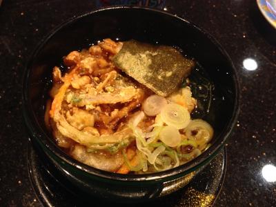 メインのうどんはやわふわ系ではないものの、いわゆる博多うどんの感じがする麺(コシがない)。薄い色、甘めのだしにあう味。