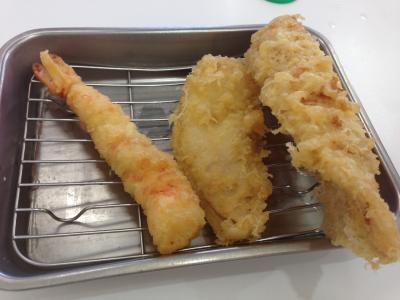 塩辛、お惣菜が美味しいのでご飯は大盛り。いつものもやし、高菜漬けに加え魚を炊いたものがありました。今回はえび、豚肉、白身魚、いか、野菜3種のお好み定食を注文。野菜天ぷらは茄子、ピーマン、安納芋。安納芋はさつまいもよりも甘みが強い感じ。揚げたてサクサクなので塩で食べても良いかも。他の天ぷらも美味い!