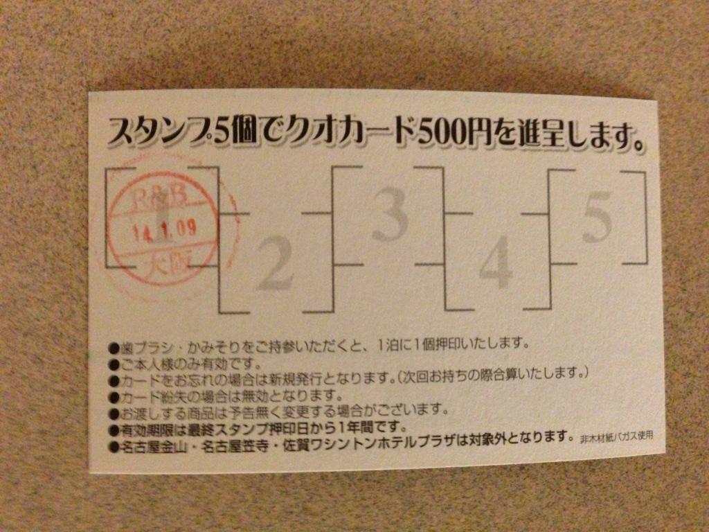 歯ブラシ、カミソリを使わない場合、フロントでスタンプを一つ押してくれます。5個貯まると500円クオカードがもらえます(スタンプカードは1年間有効/他のR&Bホテルでも同様のサービスを行っているので意外にたまるかも)