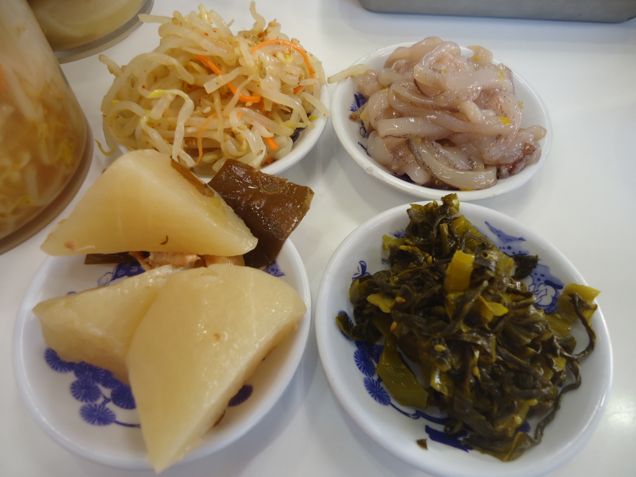 席に着くとまず、ご飯と味噌汁が運ばれてきます。テーブルには自家製のイカの塩辛(ゆずの香りがGOOD)、高菜漬け、もやしナムル、大根の煮物が置いてあって食べ放題。ご飯が進むので大盛りにした方がよいかも。それだけでお腹いっぱいになります(塩辛はお持ち帰り用あり)。