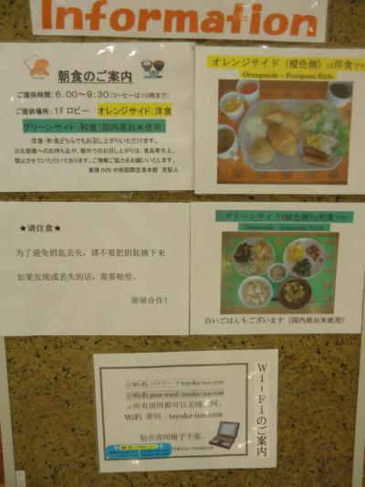 建物は名古屋側のグリーンサイド、空港側のオレンジサイドに分かれ個人予約はオレンジサイドに泊る場合が多いとか。部屋は他の東横インと変わらず。自動販売機も他よりも安め。それと広いロビーにはPCがあってプリンターも完備(無料)。出発先の観光情報をプリントアウトさせていただきました。