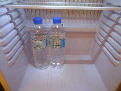 冷蔵庫はミネラルウォーターが無料。簡単なスナック類も無料で提供されます。ベッドはセミダブルサイズ(ツインだったので)。バスルームは広め。