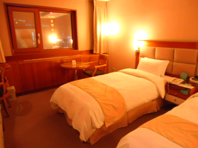 ホテルは日本のビジネスホテルのイメージ。でも部屋は広い。冷蔵庫のものは有料と勝てあるが実際は無料のミネラルウォーターが入っていただけであった。