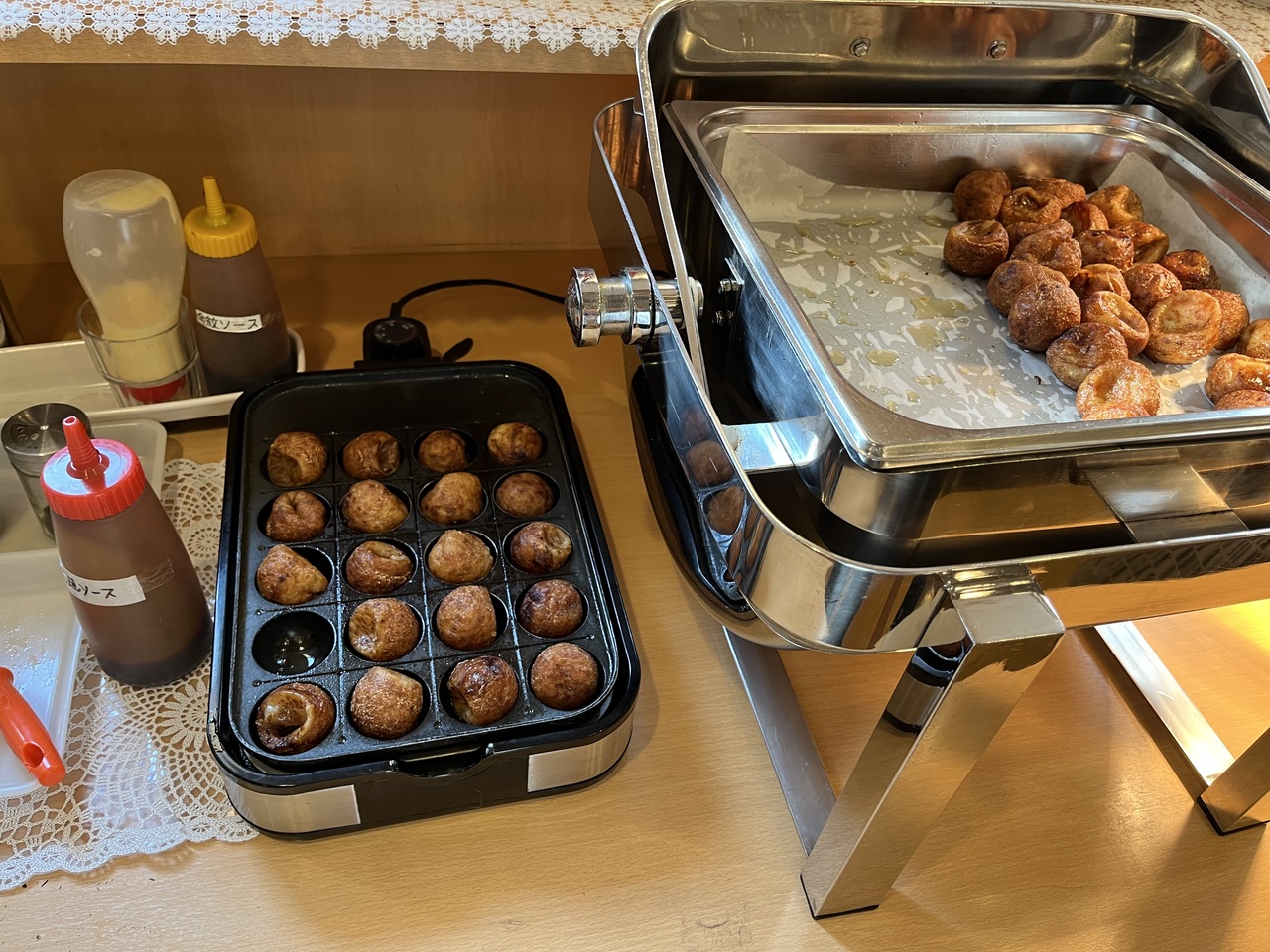 朝食は他のルートインと変わらない感もあるが、おかずの種類が充実。大阪らしくたこ焼きがあり、地元メーカーのソースも用意してあった。