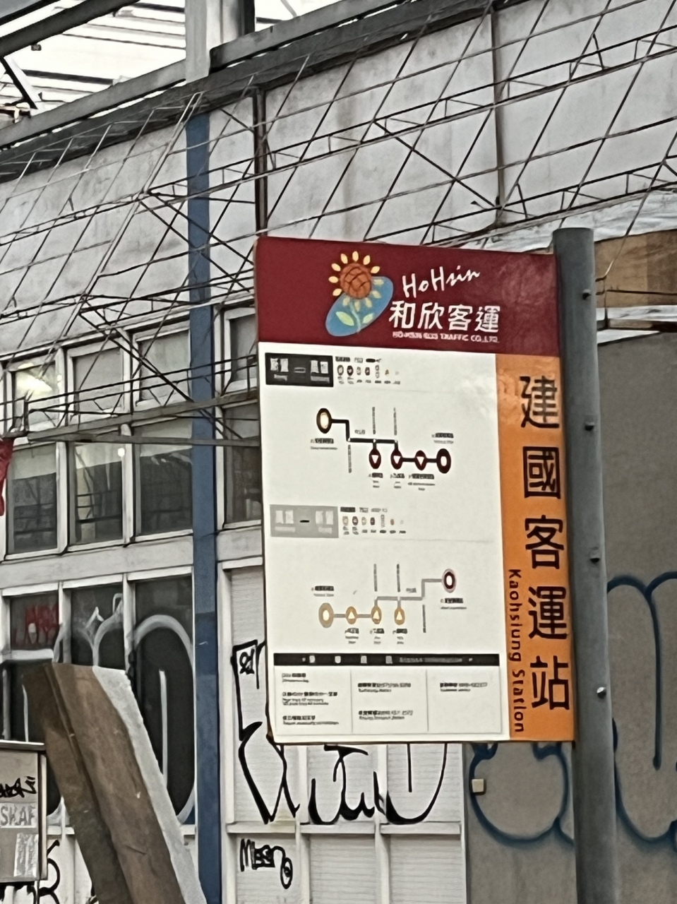 和欣客運(HO-HSIN BUS)を利用したが、高雄駅最寄りのバス停は建国總站または建国客運站。高雄と表記されることもあるが旅行者や外国人にはわかりづらいかも。ちなみに國光客運は高雄站、統聯客運(U-bus)は建国站である。