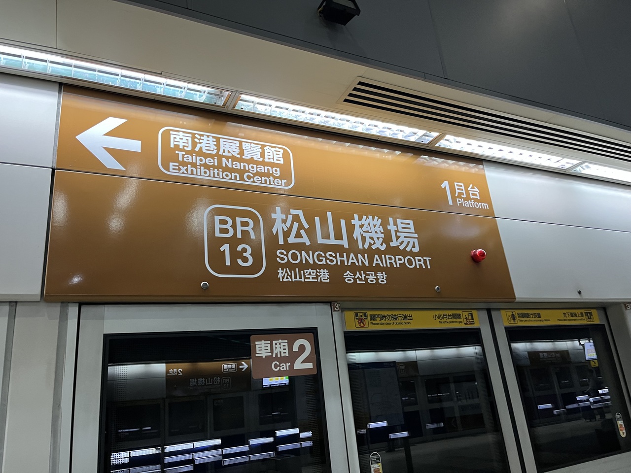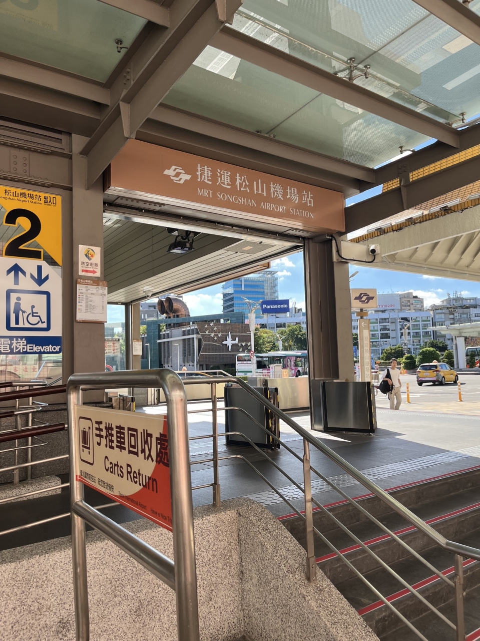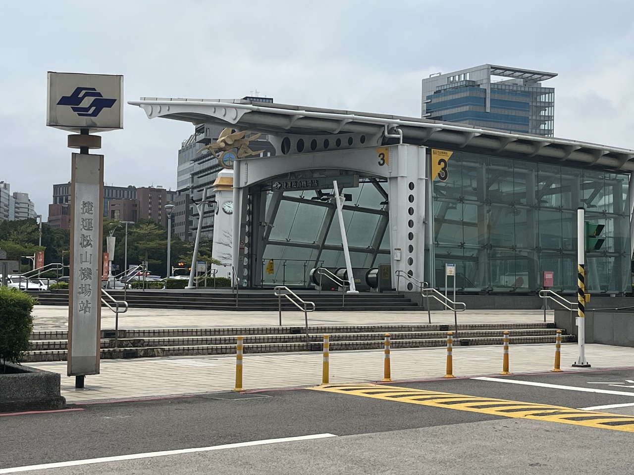 台北松山機場(空港)の真下にあるMRT文湖線の駅。空港の真下を通過するため、ひとつ手前の中山國中駅を出発すると大きく右に曲がりながら地下に入り、松山機場駅へ。この駅と大直駅は地下駅になる。