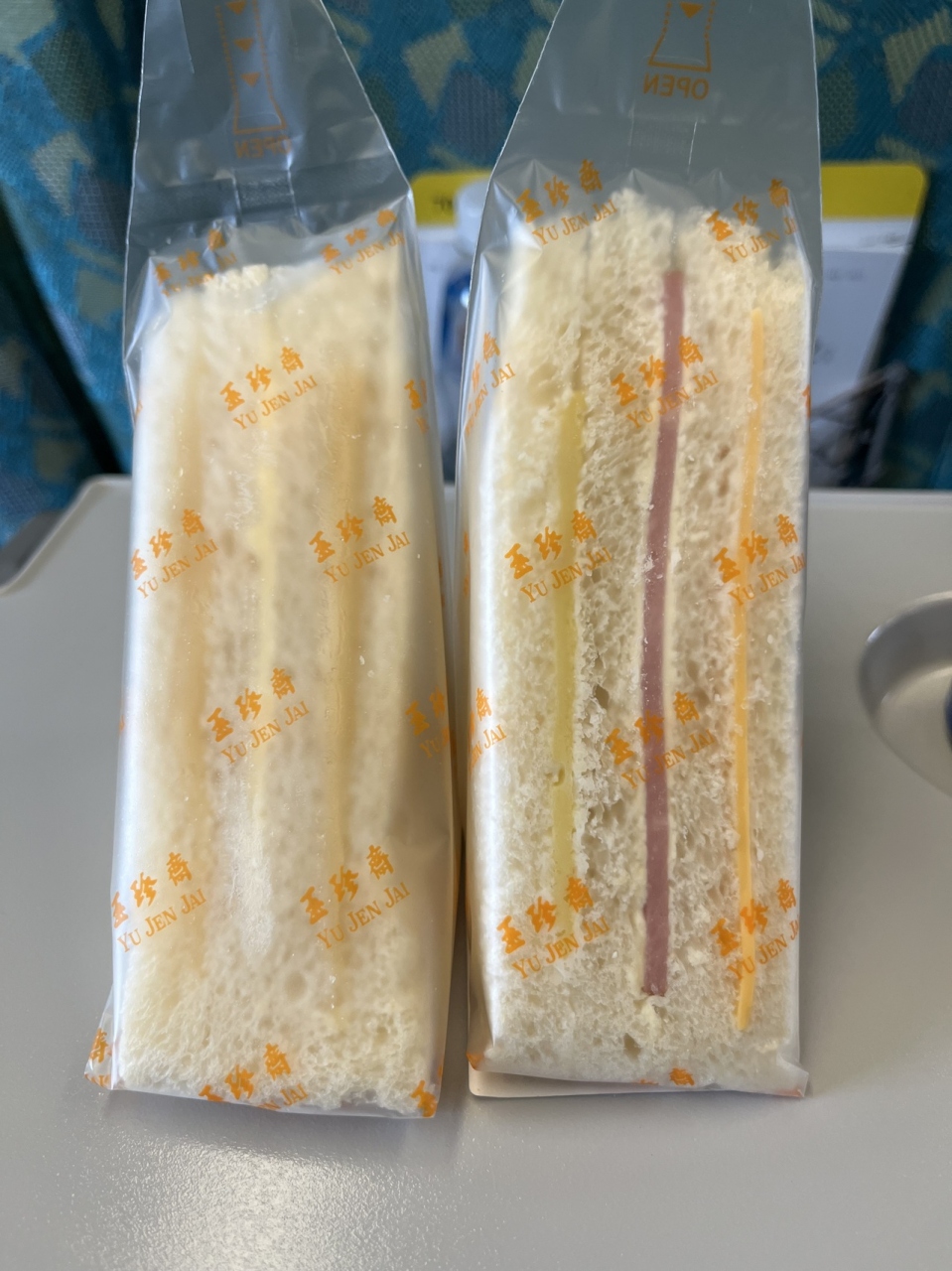 数種類あるなかから焼き芋チーズと言う名前に惹かれてしまい、定番のハムチーズエッグと一緒にチョイス。パンが若干パサパサだが台湾ローカルの味。特に焼き芋チーズは甘めのさつまいもの味が口に広がる。チーズとも合う。食べやすいので新幹線車内での軽食に最適でした。