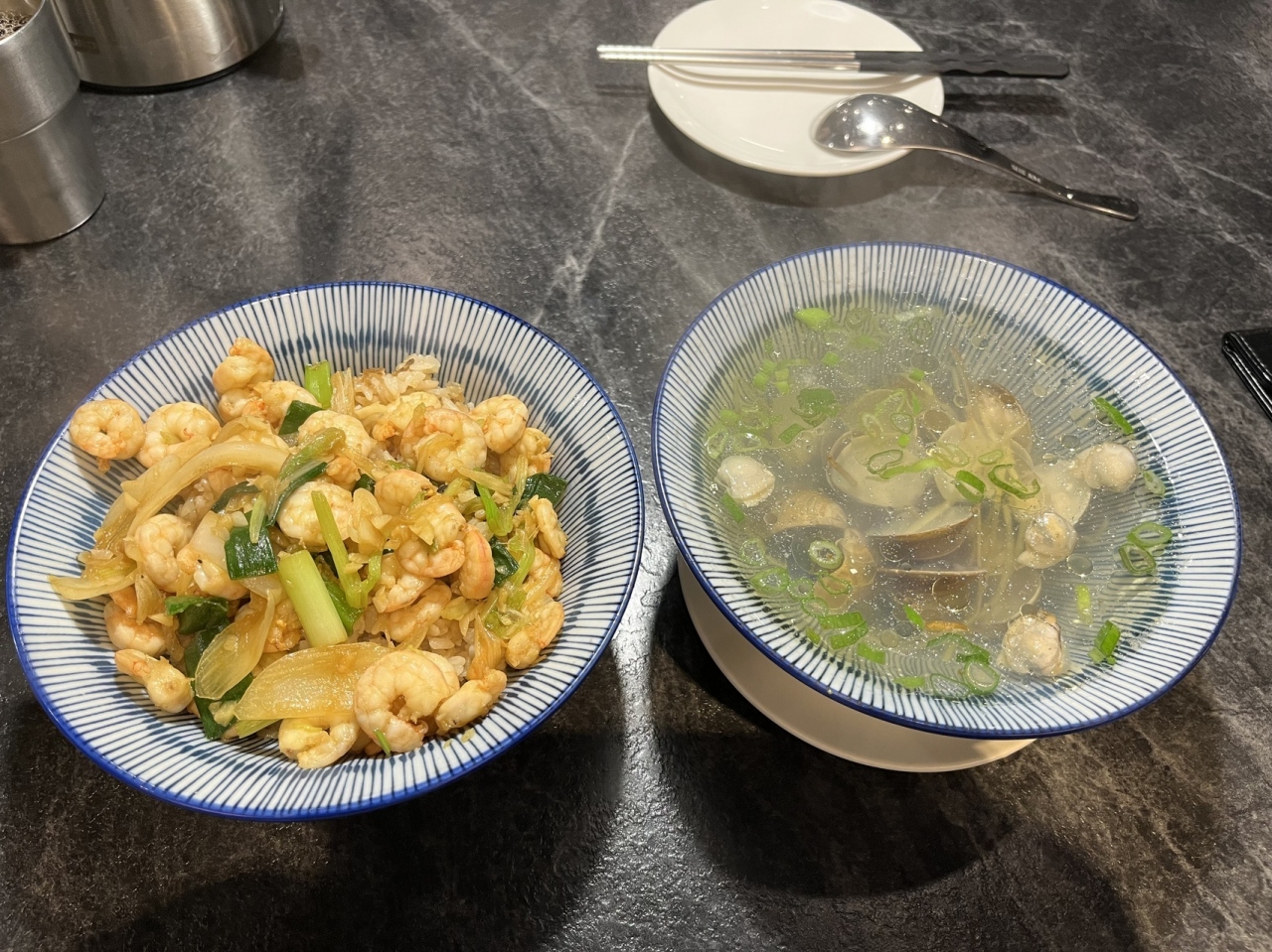 招牌蝦仁飯(海老ごはん)と薑絲蛤蜊湯(アサリのスープ)を注文。蛤(はまぐり)と書くがアサリである。