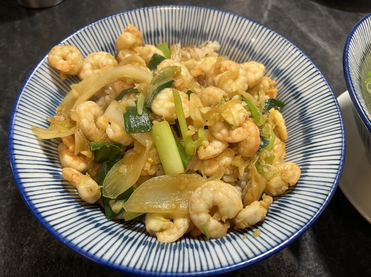 蝦仁飯は海老の出汁で炊いたご飯の上にたっぷりの海老、玉ねぎ、青菜がのっている。ご飯を口にすると海老の出汁が香る。最初は少し薄めに感じるが、食べていくとこの位で良くなってくる。美味しい。