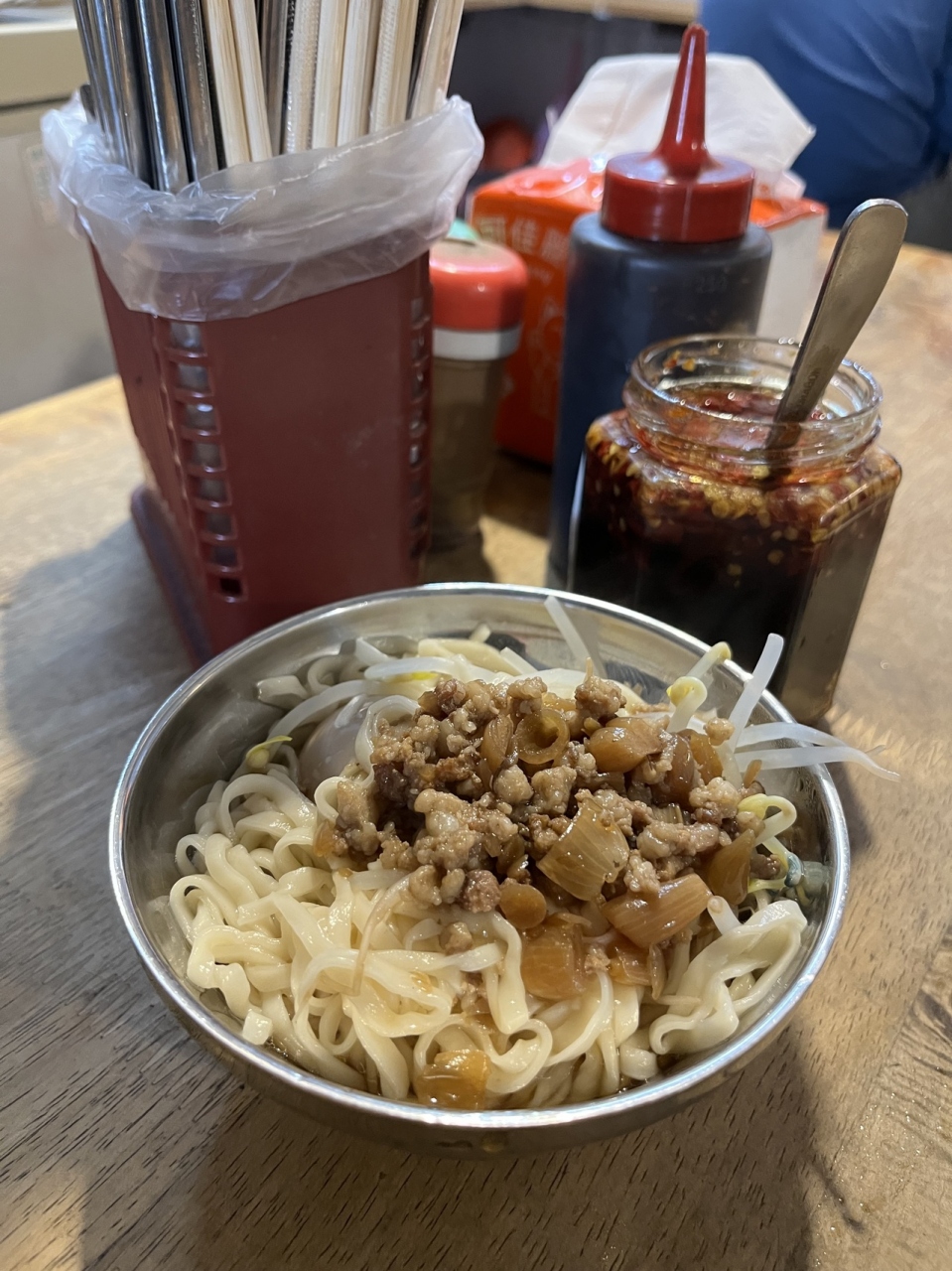 麺はコシがありもっちりした食感。肉そぼろは醤油ベースのタレで煮込れている。甘過ぎず優しい味。それとトッピングの煮卵もめちゃくちゃ美味しい。量もちょうど良くあっという間に完食。民権西路方面に宿泊の際はまた行きたい店である。