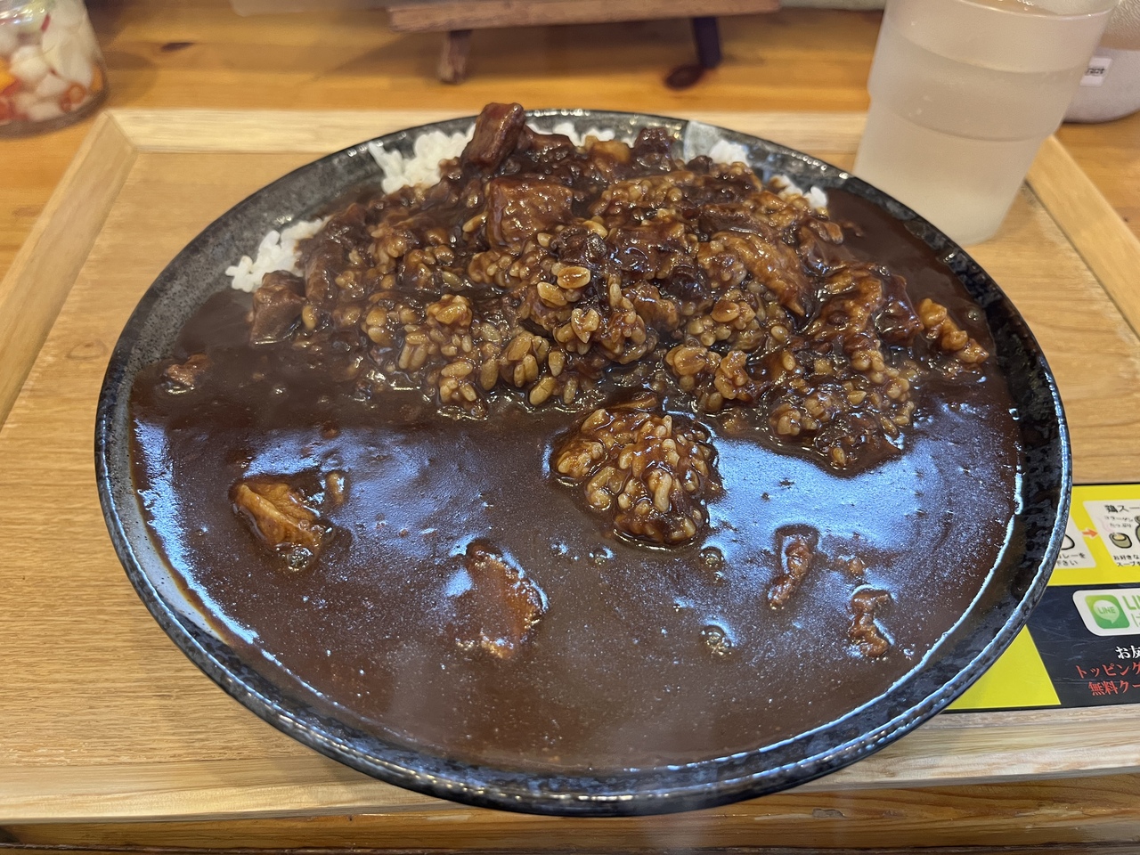 一番人気の牛とろカレー(ルー大盛)を注文。テーブルには福神漬、らっきょうの他に自家製と思われるピクルスもあって、さっぱりして美味しい。