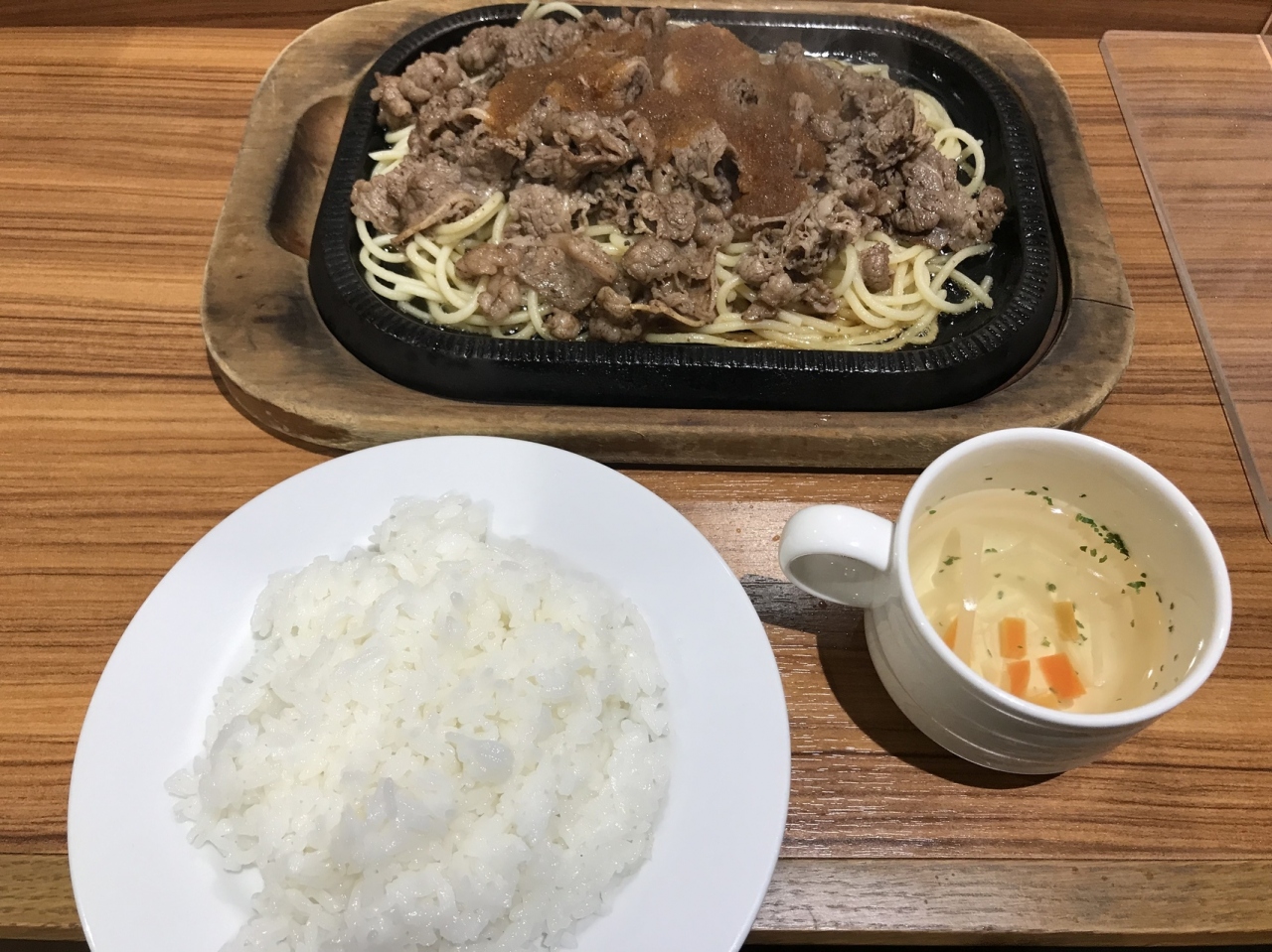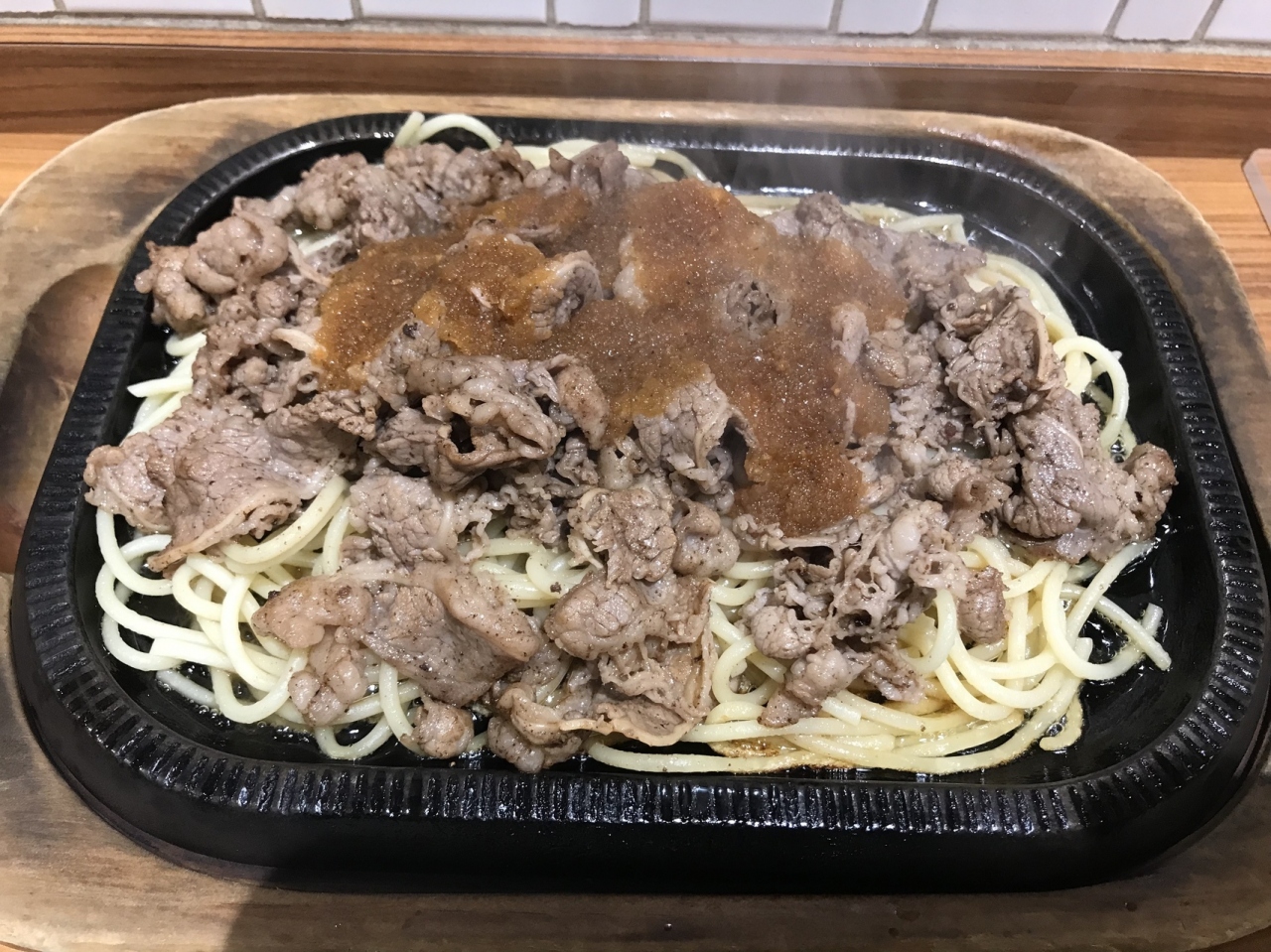 ビーフバター焼きをお肉の増量で注文。熱々の鉄板に細めのスパゲッティが敷いてあって、牛肉の薄切りがびっしり。店員さんがソースをかけると「ジュー!」という音と油が飛び散えう。ナプキンで防御・