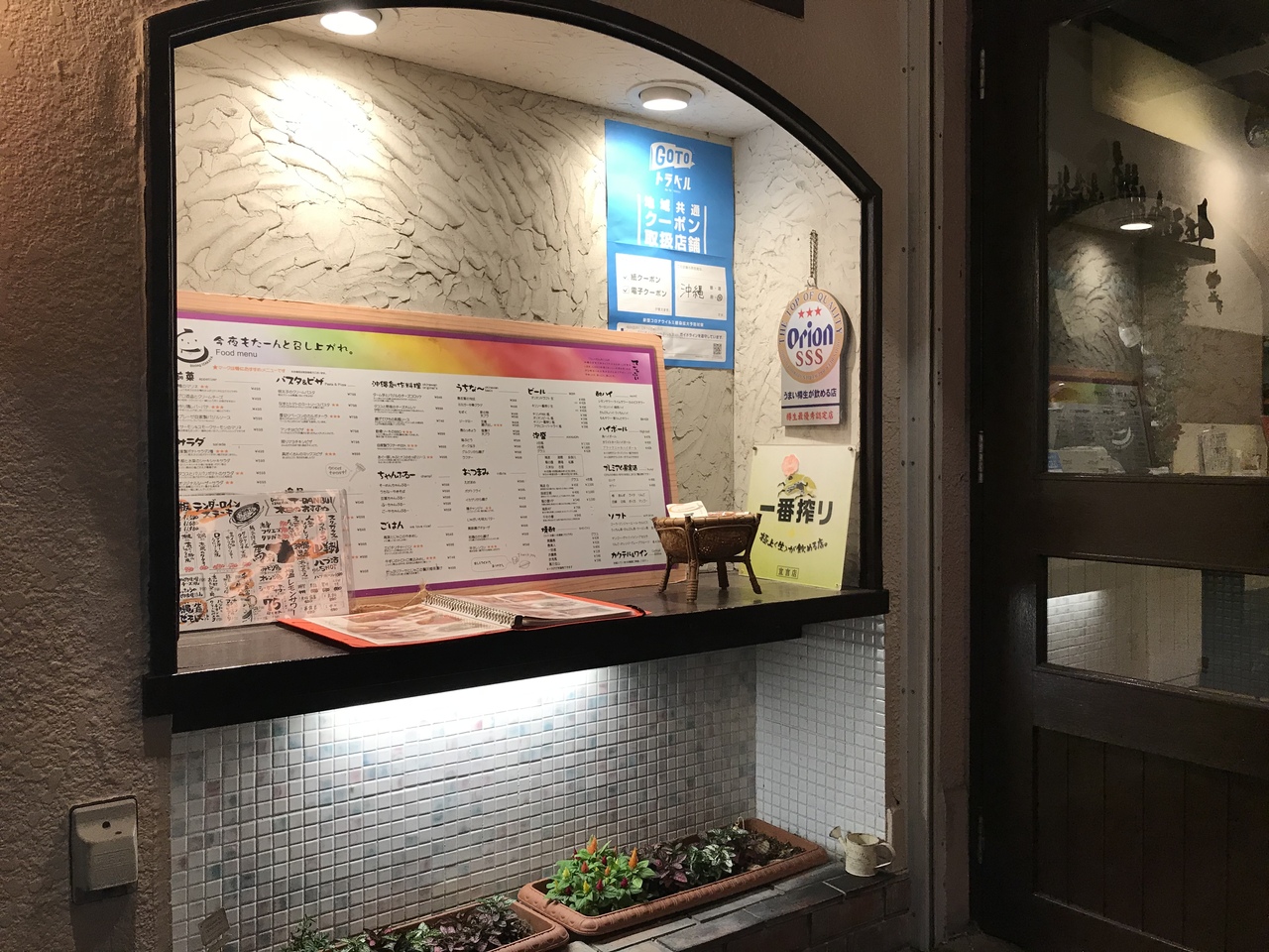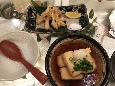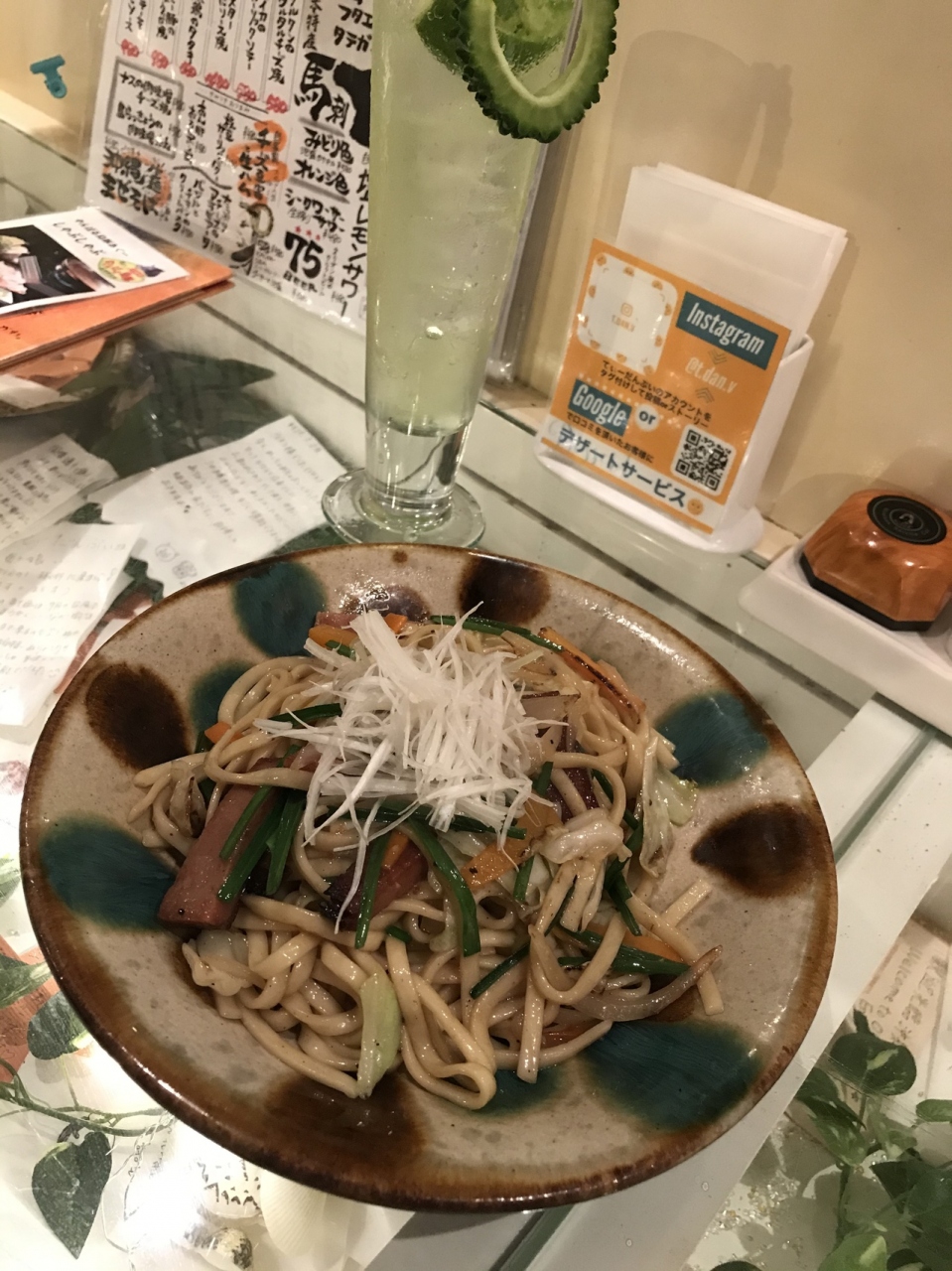 まずはシークワーサーサワーで乾杯。沖縄らしい3品が付く。その後、島ラッキョウの天ぷら、ジーマミー豆富の揚げ出し、うちなー焼きそば(沖縄そばの焼きそば)等をいただく。気に入ったのはジーマミー豆腐を使った揚げ出し。とろとろの食感は普通の豆腐では再現できない。またジーマミー豆腐の甘みを感じることもできる。コース料理もあるが、沖縄の創作料理を楽しむのも良い。- 旅行時期