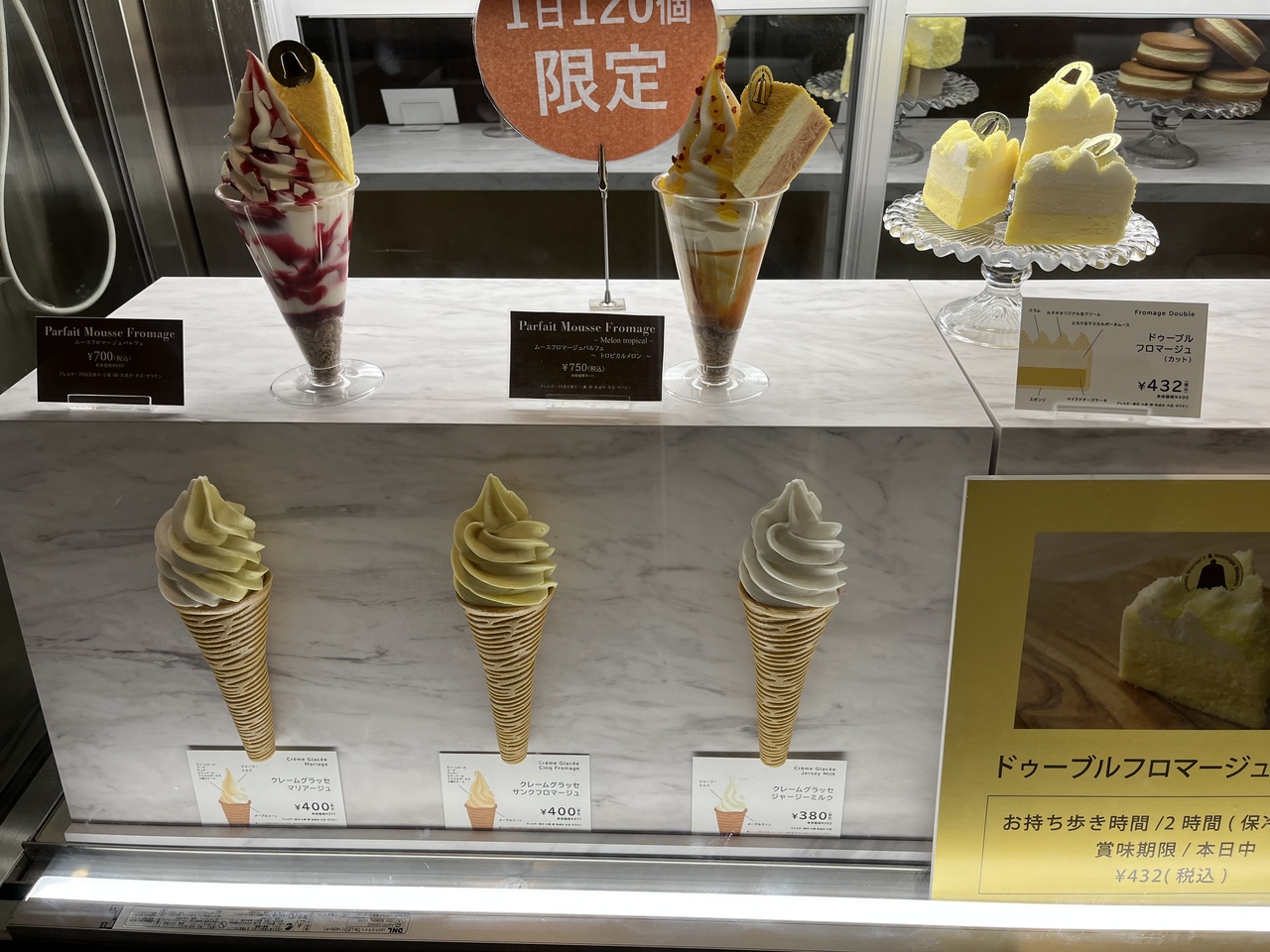 はもちろん、色々なスイーツを販売しているが、この店限定でクレームグラッセ(=ソフトクリーム)、ムースフロマージュパルフェ(=パフェ)を販売。専用のイートインスペースもある。