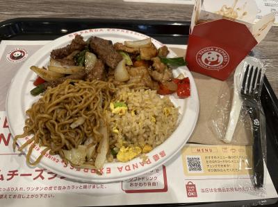 ベースをフライドライス(要は炒飯)とチャオメン(要はやきそば)にし、メインをオレンジチキン、モンゴリアンポーク、ブラックペッパーサーロインステーキの3種に。少々贅沢だがたまには良い。