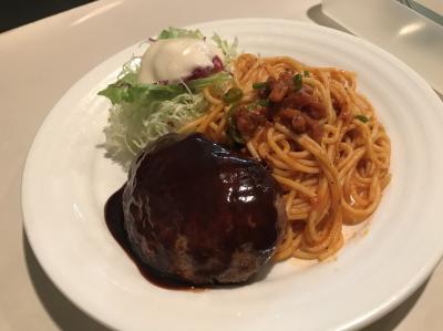 ハンバーグとナポリタンが一緒になった「スパゲティーイタリアンハンバーグ」を注文。手作り感があるハンバーグ、ナポリタン、サラダがワンプレートにまとまっている。