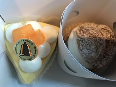 シュークリームとメロンがトッピングされたチーズケーキを購入。1時間くらいなら保冷剤で持つとのこと。