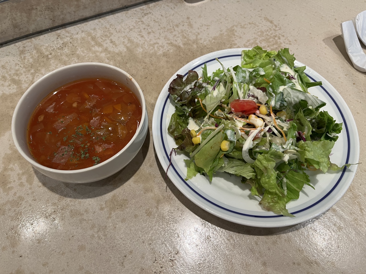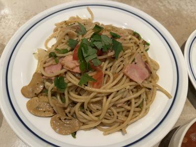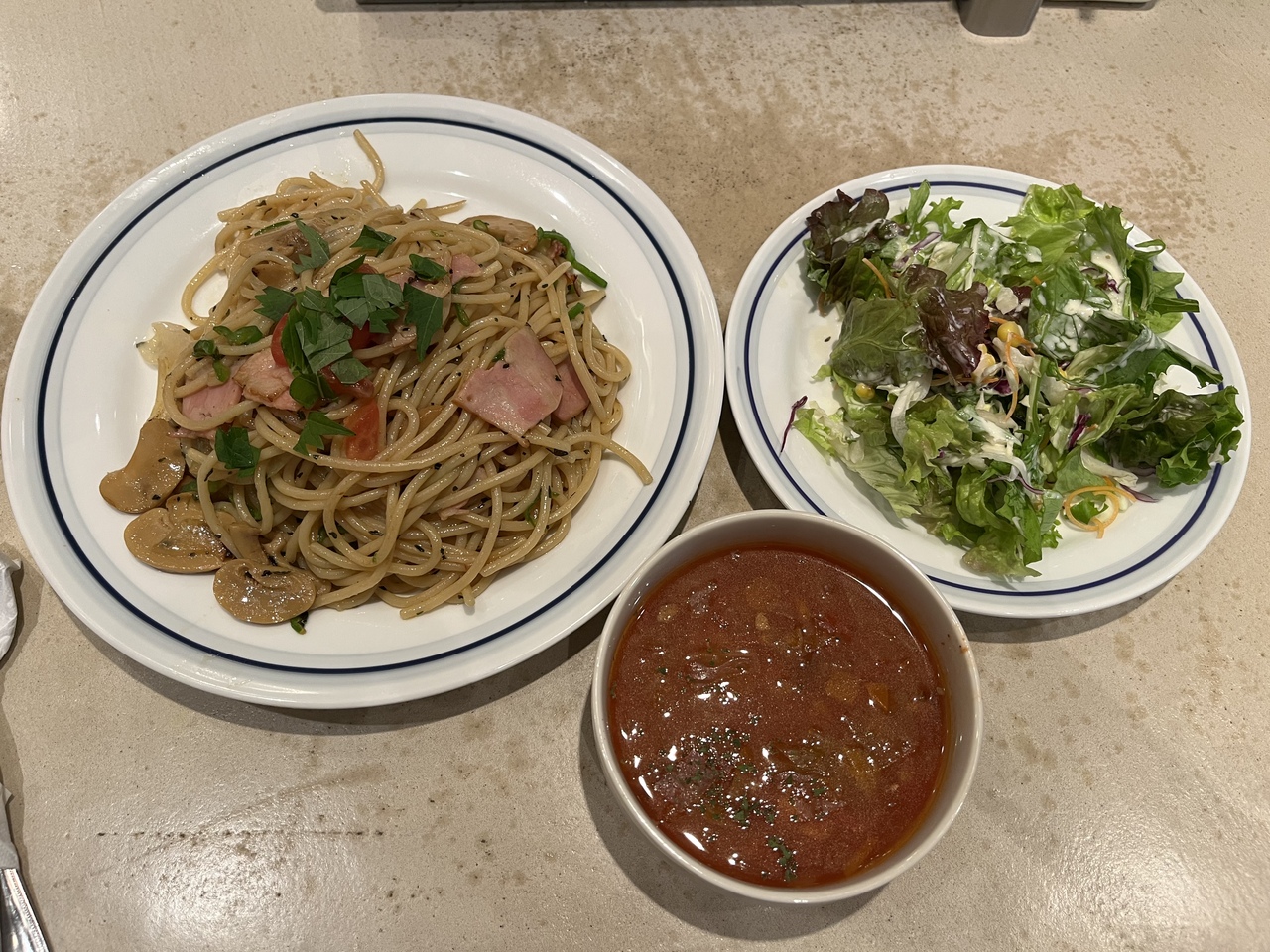 醤油バジリコのサラダ、スープのセットを注文。茹で上げたスパゲティを一皿ずつ中華鍋のようなフライパンで豪快に炒めているようで、炒める音と香りが何とも良い。