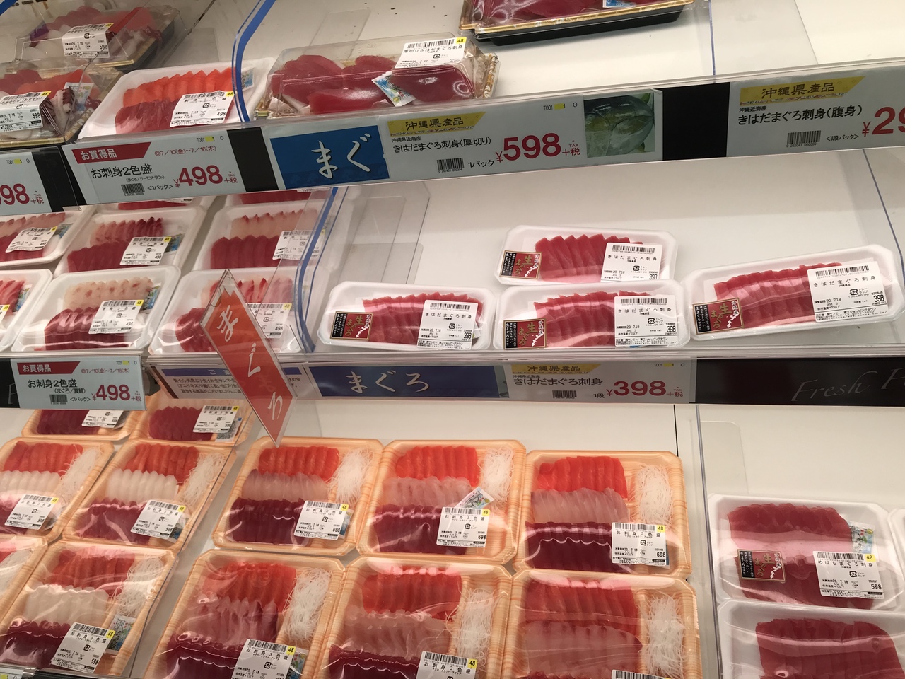 サンエー(スーパー)、マツモトキヨシ、どん亭(レストラン)が入った小さめのショッピングセンターで取り揃えは普通のスーパーと変わらないが、ここは沖縄・名護、鮮魚コーナーの刺身の充実は本土と比較にならない。特に有数の漁獲量があるマグロの充実ぶりには驚くかも。
