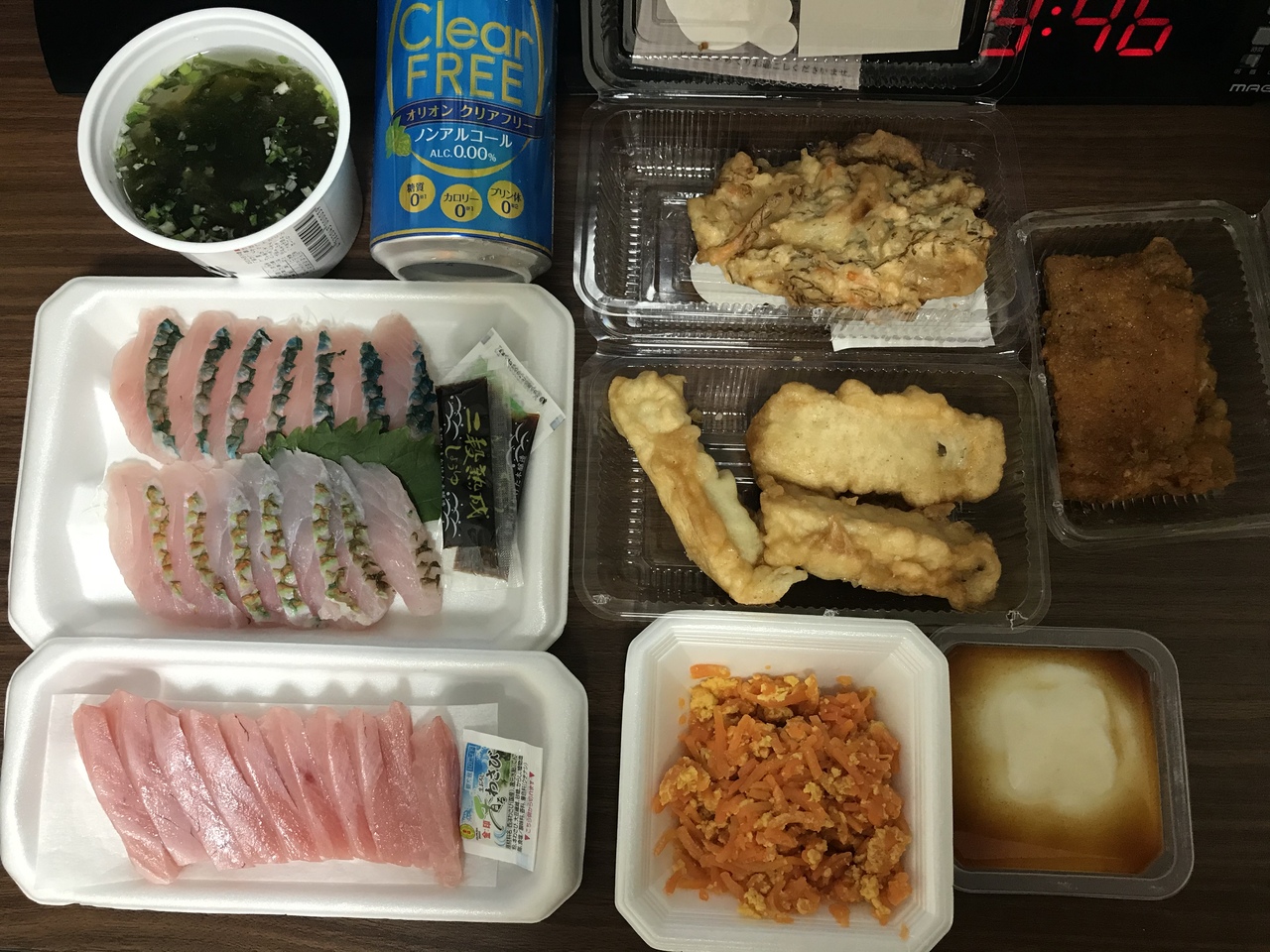 キハダマグロ(腹身)・イラブチ(ブダイ)の刺身、人参しりしり、天ぷら、じーまみーどーふ、アーサースープ等を購入し、ノンアルビール(オリオン)と一緒にホテルの部屋でいただく。刺身も総菜も本土ではなかなか味わえない味。居酒屋に行くより安く、たまには良いかも。- 旅行時期