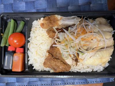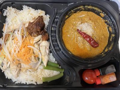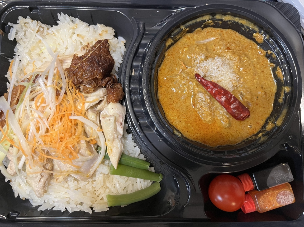 今回いただいた「シンガポールコンボ弁当」はチキンライスとシンガポールのカレーのセット。チキンライスのお米は長粒米を使用、チキンスープで炊いており、美味しい。チキンはホワイト(蒸し鶏)とブラウン(揚げ鶏)の双方が入っている。チキンの骨は外してあるのが優しい。