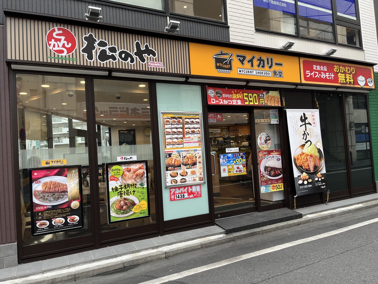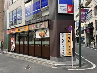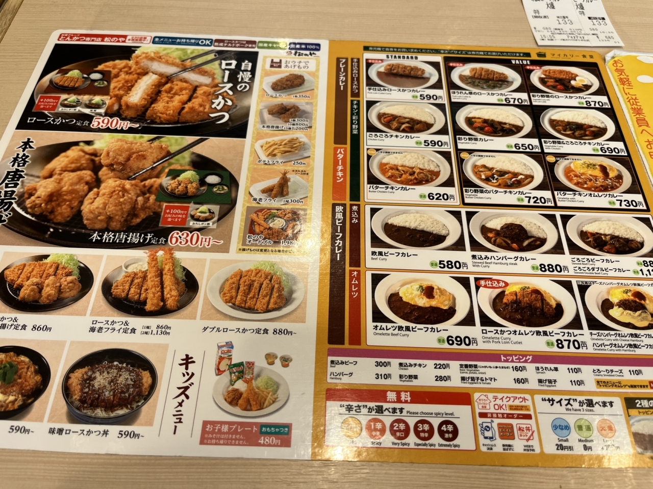 とんかつの松のやの併設店舗で、揚げ物(カツ)やサラダなどのメニューは共通。テーブルに置いてあるメニューもカレーとカツが半々である。