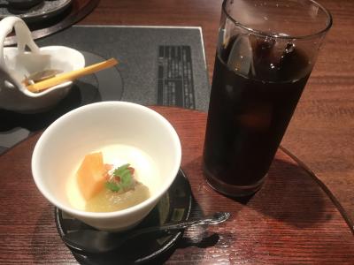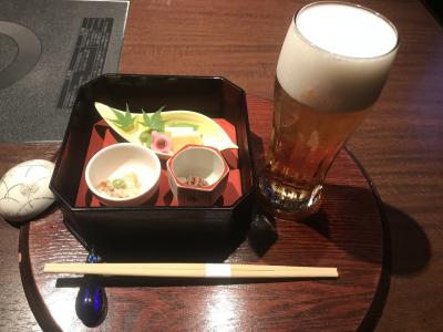 某ネット旅行サイトで予約したプランにクーポンが付いており、今回はすき焼き会席と近江牛の握りを注文。まずは前菜が生ビールとともに。近江牛を使用したものもあり、それだけで感動してしまう。