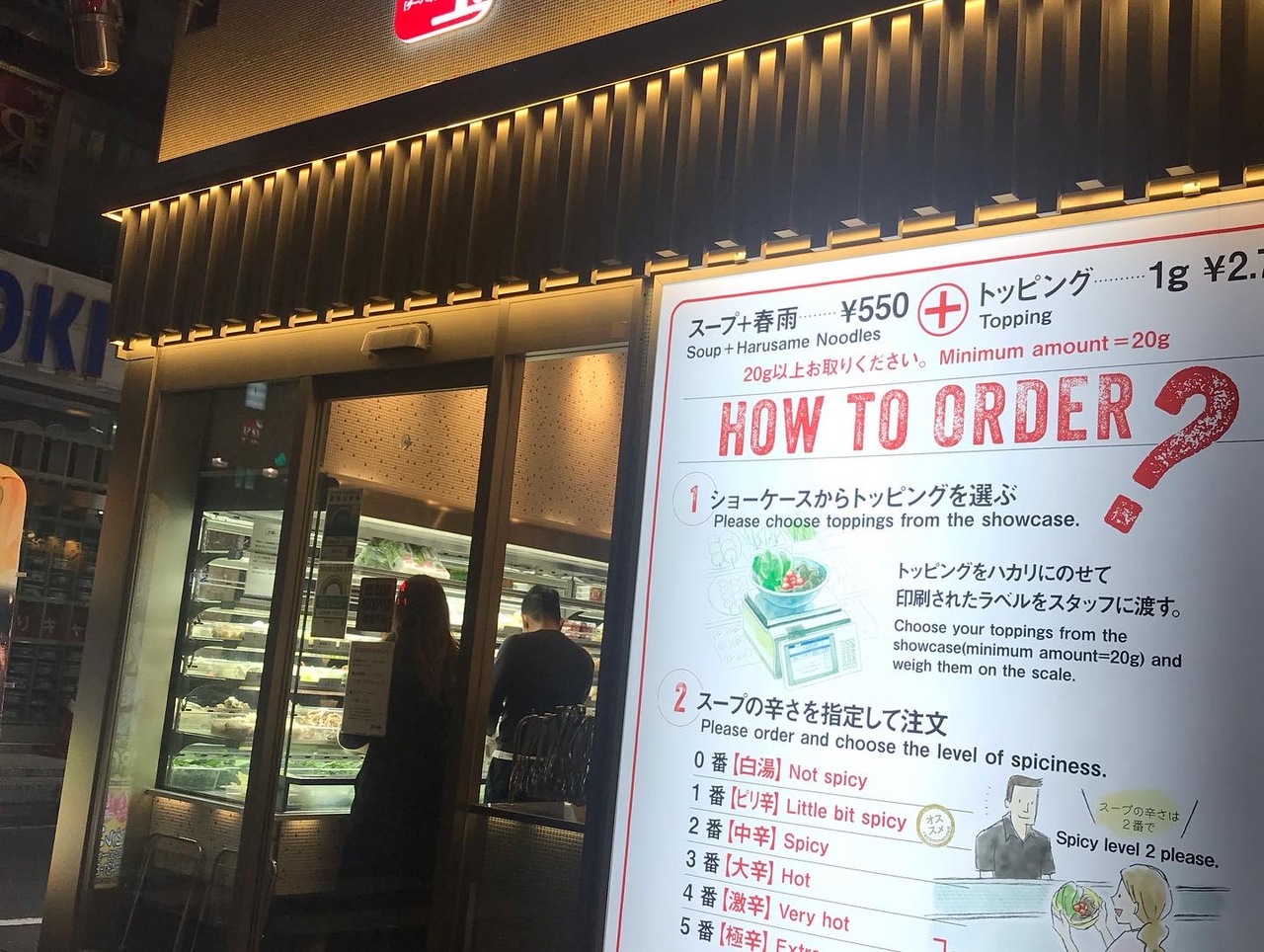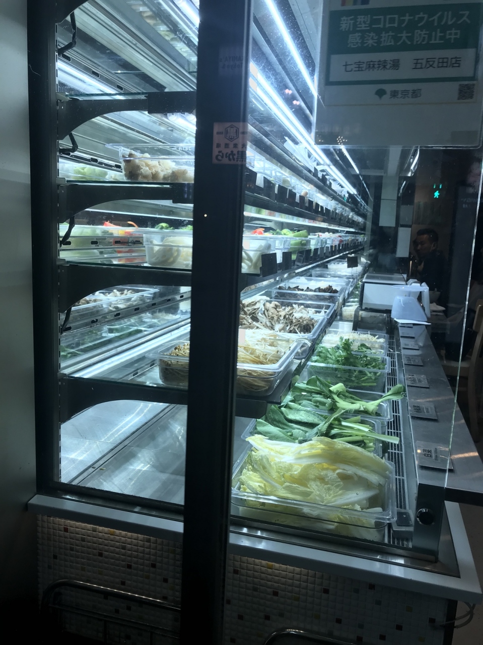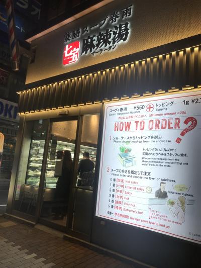 入店時、麺(春雨他)とスープ、辛さを選び、その後野菜、肉などをグラム単位(この店は1グラム2.5円)で籠にいれ、スタッフに渡す。席に着いて数分で麻辣湯到着。