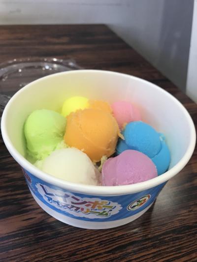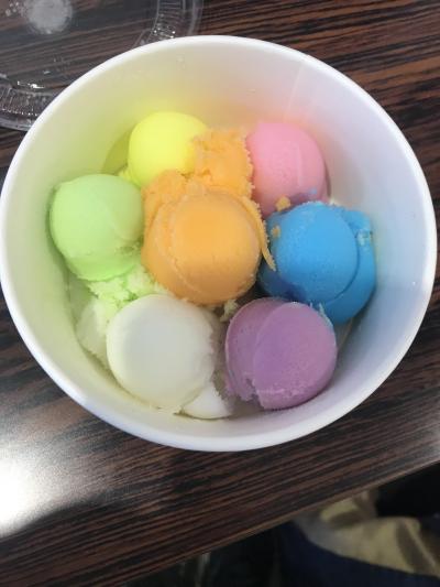 通販もできるそうなのだが、今回は店頭限定のフレーバー(オレンジ)が入っている、大カップを注文。紫(グレープ)、青(ブルーハワイ)、ピンク(ストロベリー)、黄(バナナ)、緑(メロン)、白(バニラ)に前述したオレンジ(オレンジ)が加わった7種類のアイスが入っている。アイスはめちゃくちゃ冷たい。アイスクリームというよりは乳脂肪分が少ない(あまり入っていない)氷菓に近い感じ。でもフレーバーごとに味があって美味しい。今度は夏に食べたいな。- 旅行時期