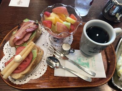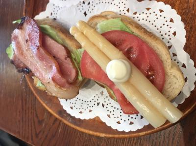 フルーツモーニングを注文。ベーコンとレタス、トマト、ホワイトアスパラ、レタスがのったオープンサンドとフルーツポンチがセット。パンはバケット。温めてある。2枚重ねななっているので自分で挟む。お洒落た感じ+めちゃくちゃ美味しい。また、フルーツポンチはいちご、バナナ、パイナップル、りんご、メロン、オレンジがたっぷり。いちご風味のシロップは甘さ控えめでフルーツの味を引き立てている。